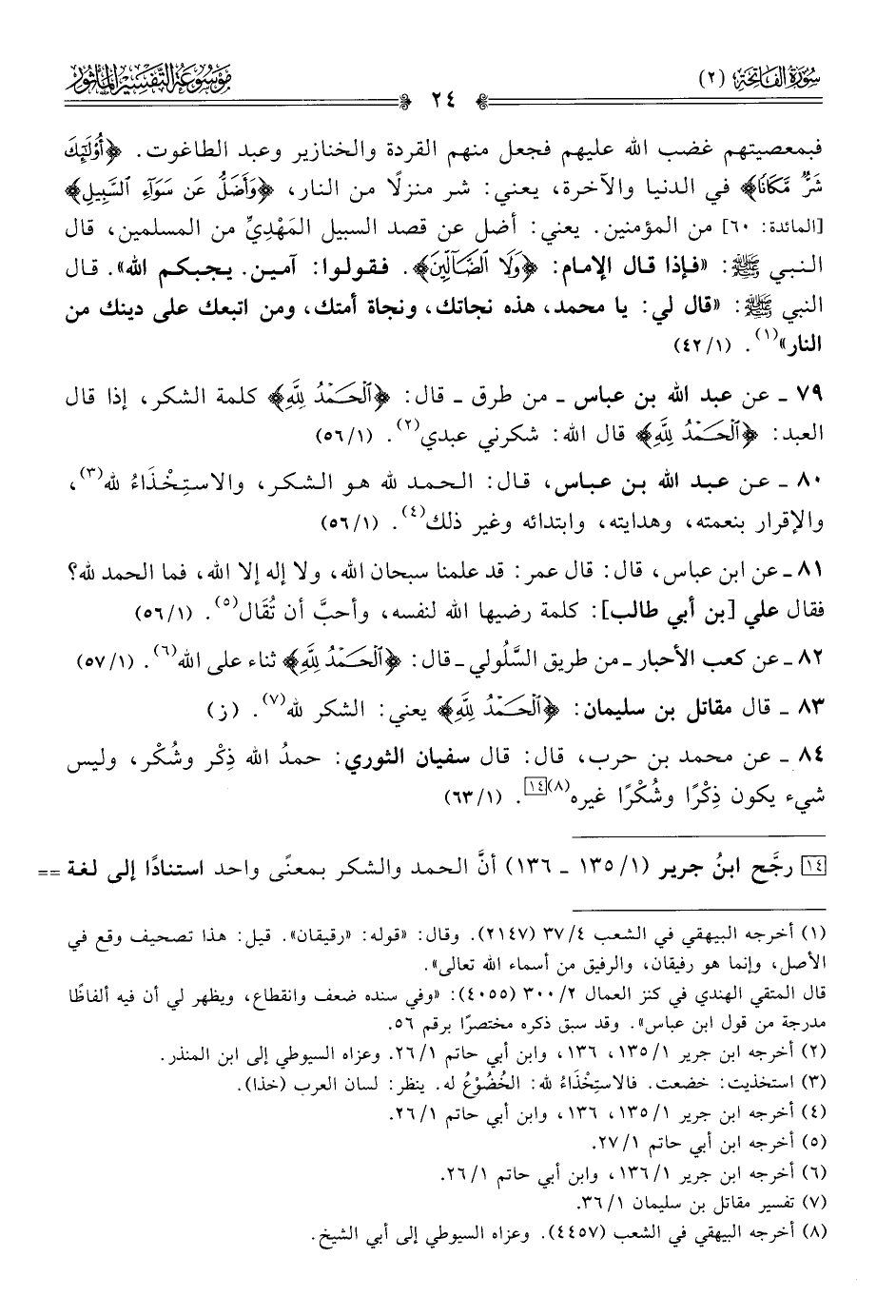 ٨٢ - عن كعب الأحبار -من طريق السَّلُولي- قال: {الحمد لله} ثناء على الله (¬٦). (١/ ٥٦)