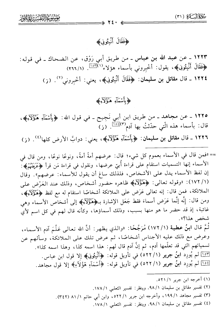 [١٥٤] لم يُورِد ابنُ جرير (١/ ٥٢٢) في تأويل قوله: {أسماء هؤلاء} إلا قول مجاهد.