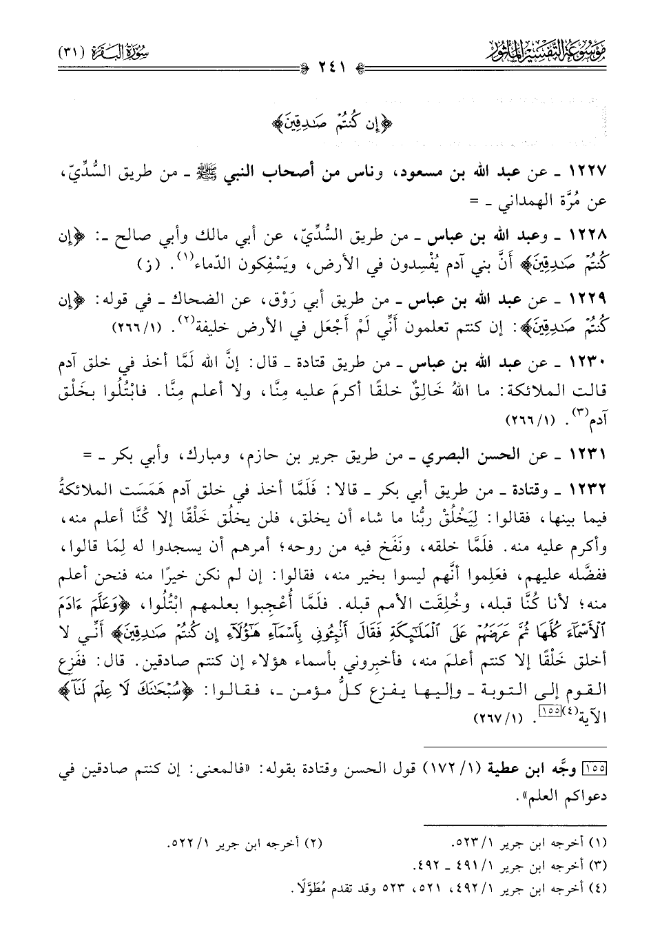 ١٢٢٨ - وعبد الله بن عباس -من طريق السُّدِّيّ، عن أبي مالك وأبي صالح- {إنْ كُنْتُمْ صادِقِينَ} أنَّ بني آدم يُفْسِدون في الأرض، ويَسْفِكون الدّماء (¬١). (ز)