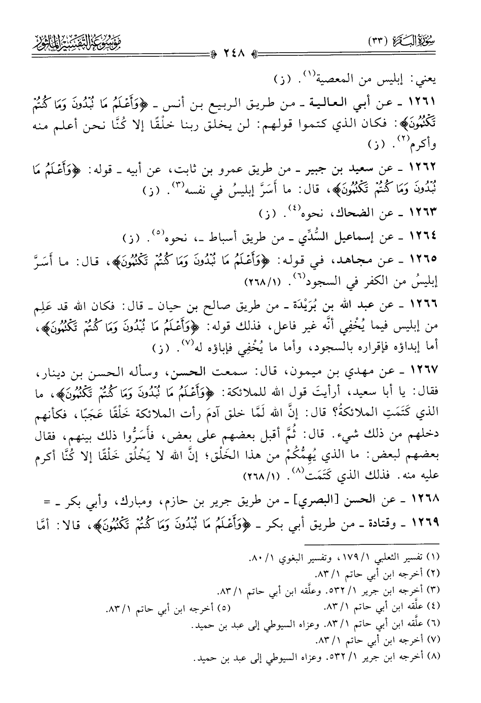١٢٦٩ - وقتادة -من طريق أبي بكر- {وأعلم ما تبدون وما كنتم تكتمون}، قالا: أمّا