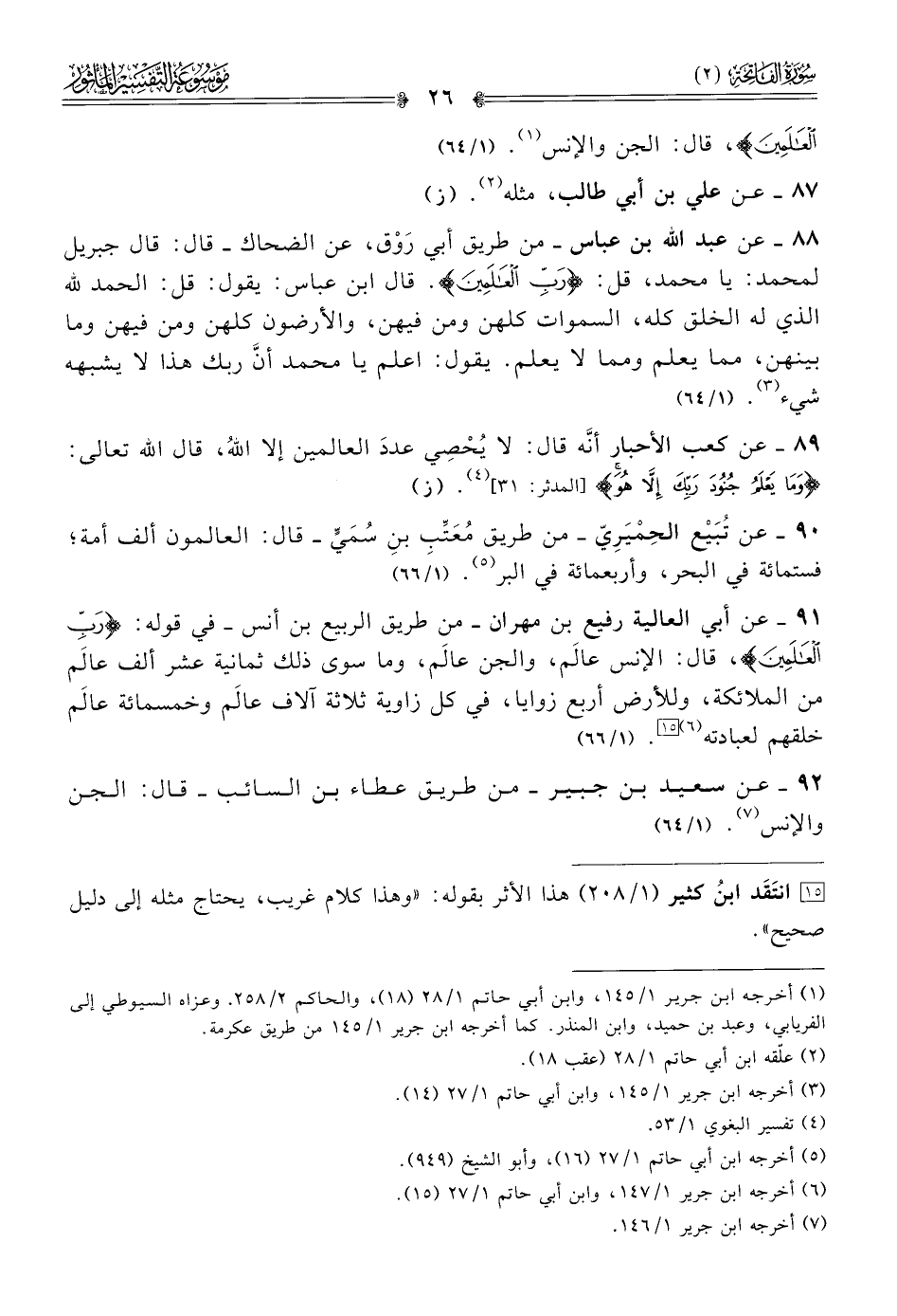 ٩١ - عن أبي العالية رفيع بن مهران -من طريق الربيع بن أنس- في قوله: {رَبِّ العالمين}، قال: الإنس عالَم، والجن عالَم، وما سوى ذلك ثمانية عشر ألف عالَم من الملائكة، وللأرض أربع زوايا، في كل زاوية ثلاثة آلاف عالَم وخمسمائة عالَم خلقهم لعبادته (¬٦) [١٥]. (١/ ٦٦)