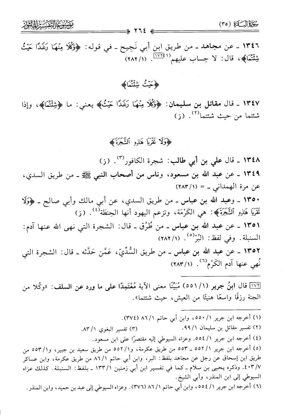 ١٣٤٦ - عن مجاهد -من طريق ابن أبي نَجِيح- في قوله: {وكلا منها رغدا حيث شئتما}، قال: لا حِساب عليهم (¬١) [١٧٢]. (١/ ٢٨٢)