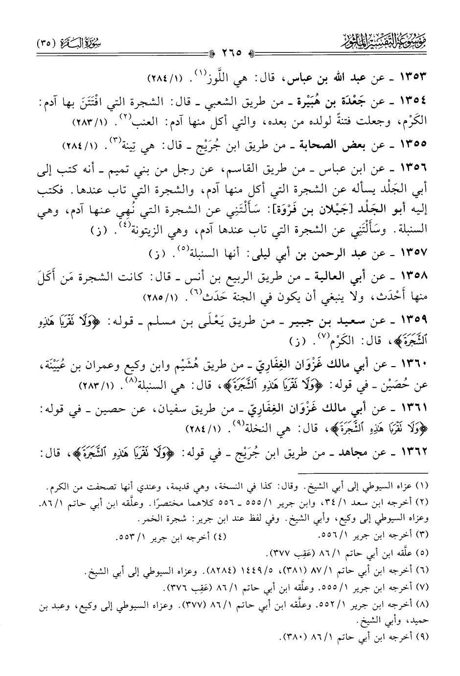 ١٣٥٤ - عن جَعْدَة بن هُبَيْرة -من طريق الشعبي- قال: الشجرة التي افْتَتَنَ بها آدم: الكَرْم، وجعلت فتنةً لولده من بعده، والتي أكل منها آدم: العنب (¬٢). (١/ ٢٨٣)