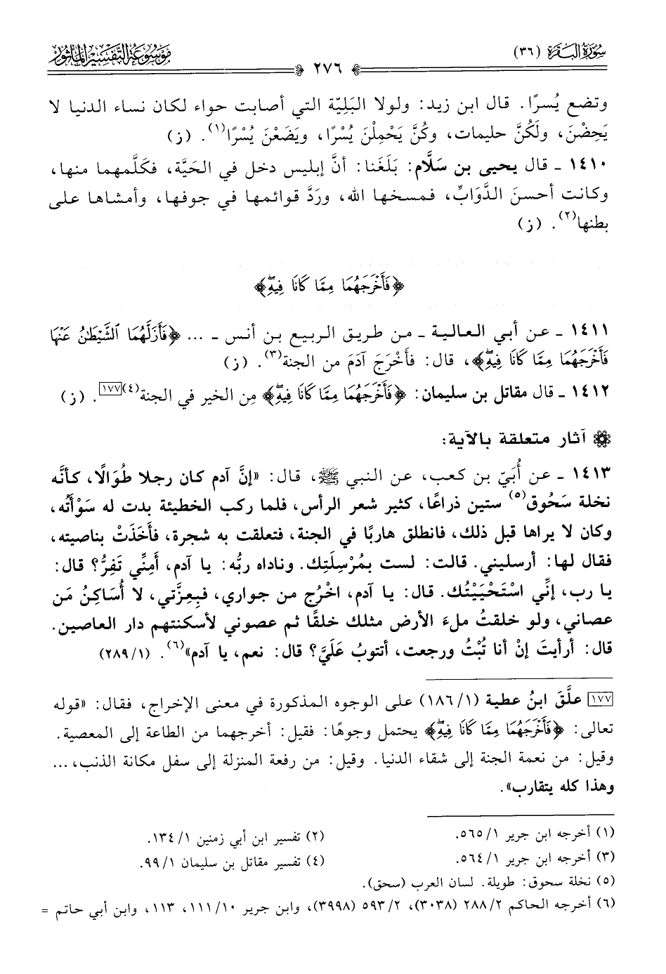 [١٧٧] علَّقَ ابنُ عطية (١/ ١٨٦) على الوجوه المذكورة في معنى الإخراج، فقال: «قوله تعالى: {فَأَخْرَجَهُما مِمّا كانا فِيهِ} يحتمل وجوهًا: فقيل: أخرجهما من الطاعة إلى المعصية. وقيل: من نعمة الجنة إلى شقاء الدنيا. وقيل: من رفعة المنزلة إلى سفل مكانة الذنب، ... وهذا كله يتقارب».