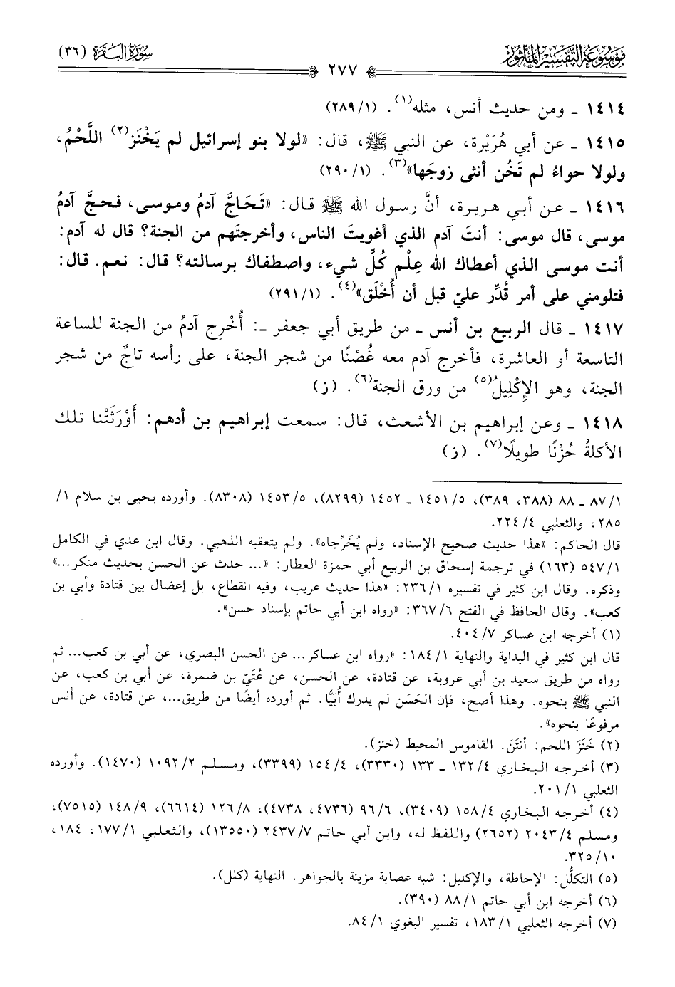 ١٤١٦ - عن أبي هريرة، أنّ رسول الله - صلى الله عليه وسلم - قال: «تَحاجَّ آدمُ وموسى، فحجَّ آدمُ موسى، قال موسى: أنتَ آدم الذي أغويتَ الناس، وأخرجتَهم من الجنة؟ قال له آدم: أنت موسى الذي أعطاك الله عِلْم كُلِّ شيء، واصطفاك برسالته؟ قال: نعم. قال: فتلومني على أمر قُدِّر عليّ قبل أن أُخْلَق» (¬٤). (١/ ٢٩١)