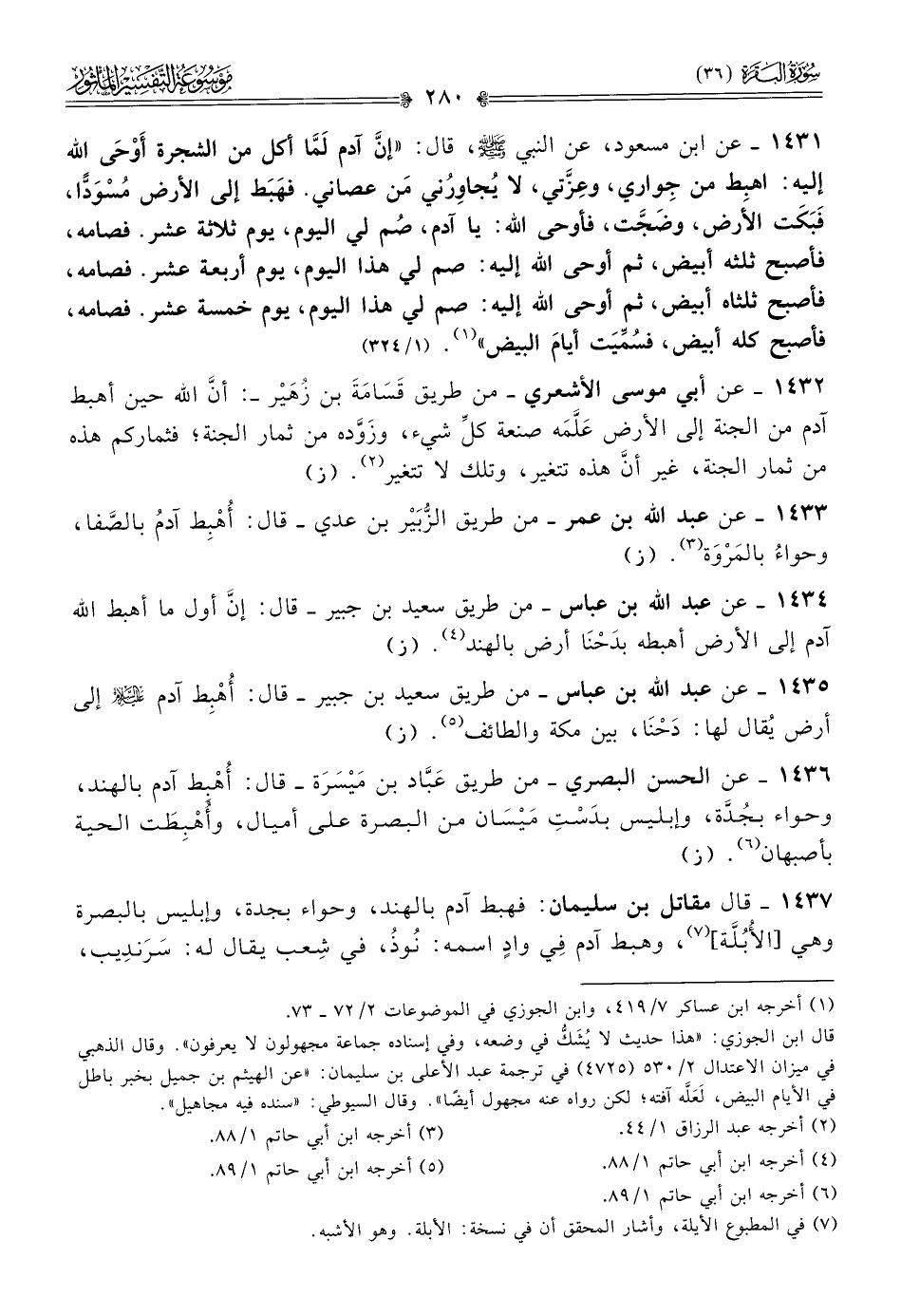 ١٤٣١ - عن ابن مسعود، عن النبي - صلى الله عليه وسلم -، قال: «إنّ آدم لَمّا أكل من الشجرة أوْحى الله إليه: اهبِط من جِواري، وعِزَّتي، لا يُجاوِرُني مَن عصاني. فهَبَط إلى الأرض مُسْوَدًّا، فَبَكَت الأرض، وضَجَّت، فأوحى الله: يا آدم، صُم لي اليوم، يوم ثلاثة عشر. فصامه، فأصبح ثلثه أبيض، ثم أوحى الله إليه: صم لي هذا اليوم، يوم أربعة عشر. فصامه، فأصبح ثلثاه أبيض، ثم أوحى الله إليه: صم لي هذا اليوم، يوم خمسة عشر. فصامه، فأصبح كله أبيض، فسُمِّيَت أيامَ البيض» (¬١).
