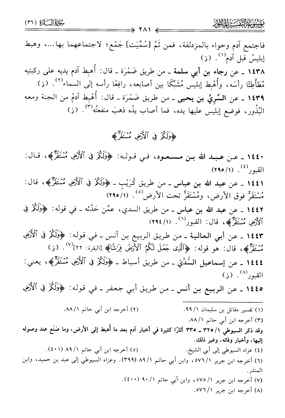١٤٤١ - عن عبد الله بن عباس -من طريق كُرَيْبٍ- {ولكم في الأرض مستقر}، قال: مُسْتَقَرٌّ فوق الأرض، ومُسْتَقَرٌّ تحت الأرض (¬٥). (١/ ٢٩٥)
