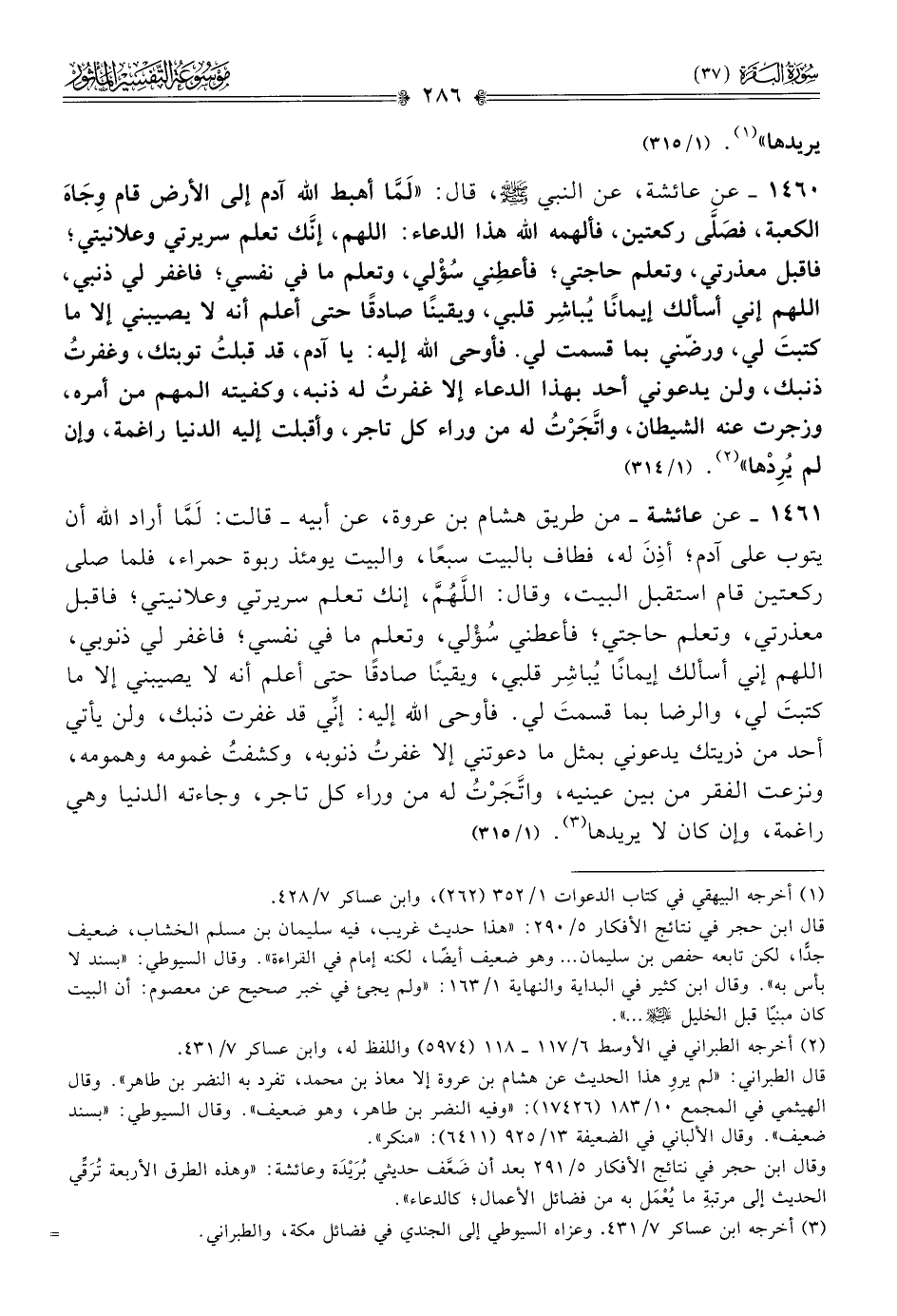 ١٤٦١ - عن عائشة -من طريق هشام بن عروة، عن أبيه- قالت: لَمّا أراد الله أن يتوب على آدم؛ أذِنَ له، فطاف بالبيت سبعًا، والبيت يومئذ ربوة حمراء، فلما صلى ركعتين قام استقبل البيت، وقال: اللَّهُمَّ، إنك تعلم سريرتي وعلانيتي؛ فاقبل معذرتي، وتعلم حاجتي؛ فأعطني سُؤْلي، وتعلم ما في نفسي؛ فاغفر لي ذنوبي، اللهم إني أسألك إيمانًا يُباشِر قلبي، ويقينًا صادقًا حتى أعلم أنه لا يصيبني إلا ما كتبتَ لي، والرضا بما قسمتَ لي. فأوحى الله إليه: إنِّي قد غفرت ذنبك، ولن يأتي أحد من ذريتك يدعوني بمثل ما دعوتني إلا غفرتُ ذنوبه، وكشفتُ غمومه وهمومه، ونزعت الفقر من بين عينيه، واتَّجَرْتُ له من وراء كل تاجر، وجاءته الدنيا وهي راغمة، وإن كان لا يريدها (¬٣). (١/ ٣١٥)