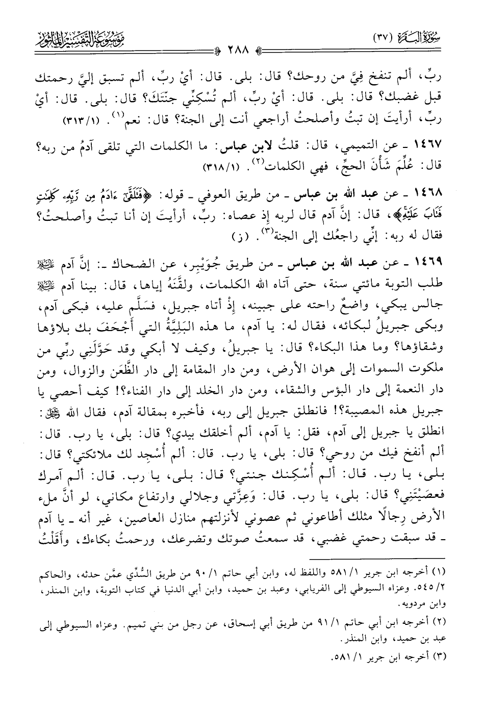 ١٤٦٨ - عن عبد الله بن عباس -من طريق العوفي- قوله: {فتلقى آدم من ربه كلمات فتاب عليه}، قال: إنّ آدم قال لربه إذ عصاه: ربِّ، أرأيتَ إن أنا تبتُ وأصلحتُ؟ فقال له ربه: إنِّي راجعُك إلى الجنة (¬٣). (ز)