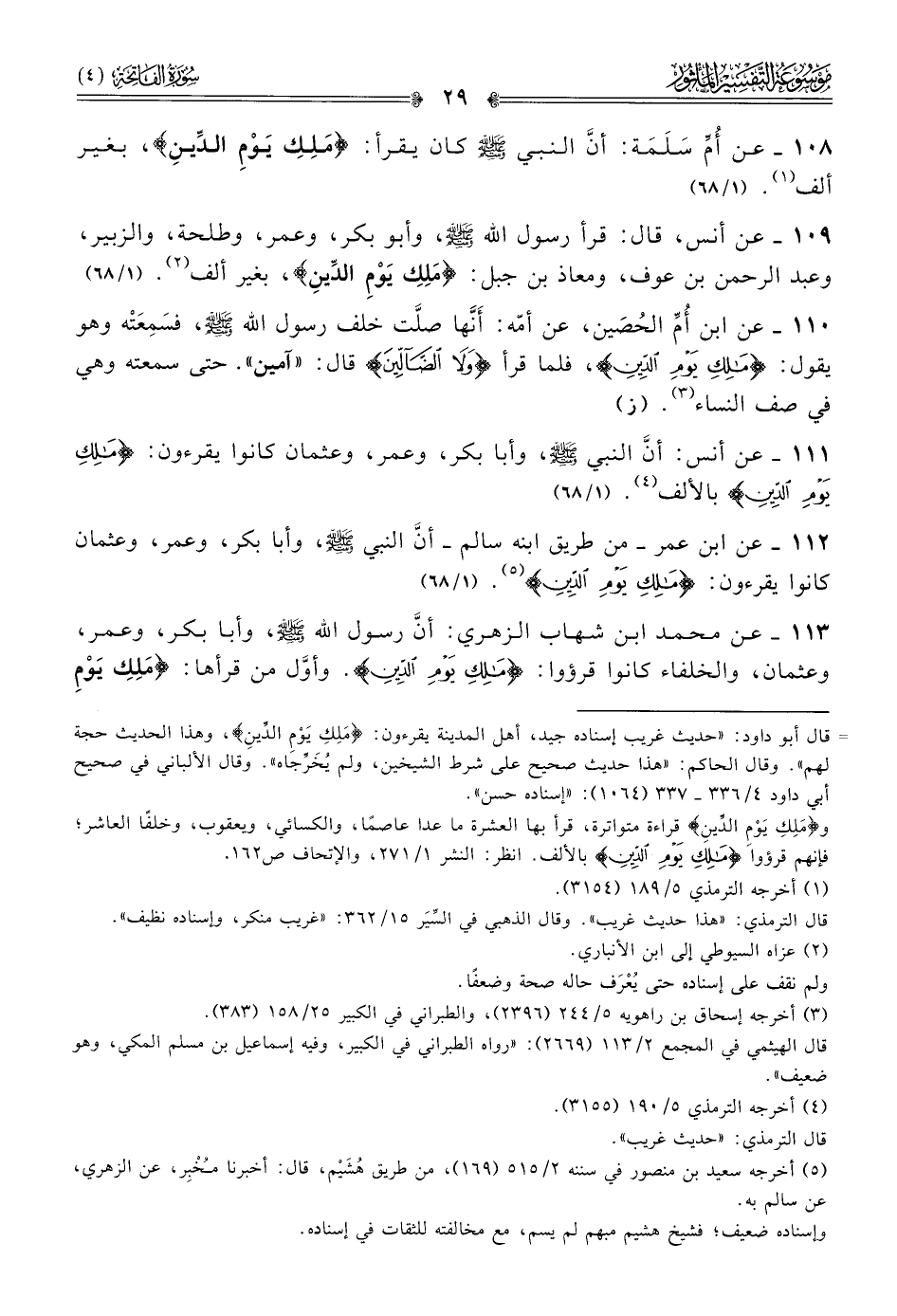 ١١٣ - عن محمد ابن شهاب الزهري: أنّ رسول الله - صلى الله عليه وسلم -، وأبا بكر، وعمر، وعثمان، والخلفاء كانوا قرؤوا: {مالِكِ يَوْمِ الدِّينِ}. وأوَّل من قرأها: «مَلِكِ يَوْمِ
