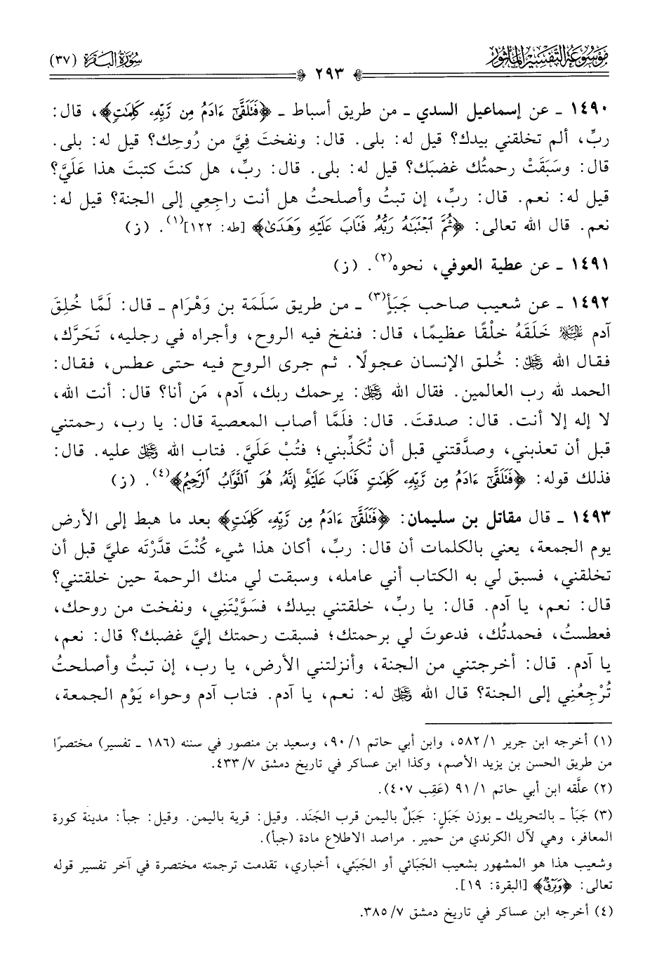 ١٤٩٢ - عن شعيب صاحب جَبَأٍ (¬٣) -من طريق سَلَمَة بن وهْرام- قال: لَمّا خُلِقَ آدم - عليه السلام - خَلَقَهُ خلْقًا عظيمًا، قال: فنفخ فيه الروح، وأجراه في رجليه، تَحَرَّك، فقال الله - عز وجل -: خُلق الإنسان عجولًا. ثم جرى الروح فيه حتى عطس، فقال: الحمد لله رب العالمين. فقال الله - عز وجل -: يرحمك ربك، آدم، مَن أنا؟ قال: أنت الله، لا إله إلا أنت. قال: صدقتَ. قال: فلَمّا أصاب المعصية قال: يا رب، رحمتني قبل أن تعذبني، وصدَّقتني قبل أن تُكَذِّبني؛ فتُبْ عَلَيَّ. فتاب الله - عز وجل - عليه. قال: فذلك قوله: {فتلقى ادم من ربه كلمات فتاب عليه إنه هو التواب الرحيم} (¬٤). (ز)