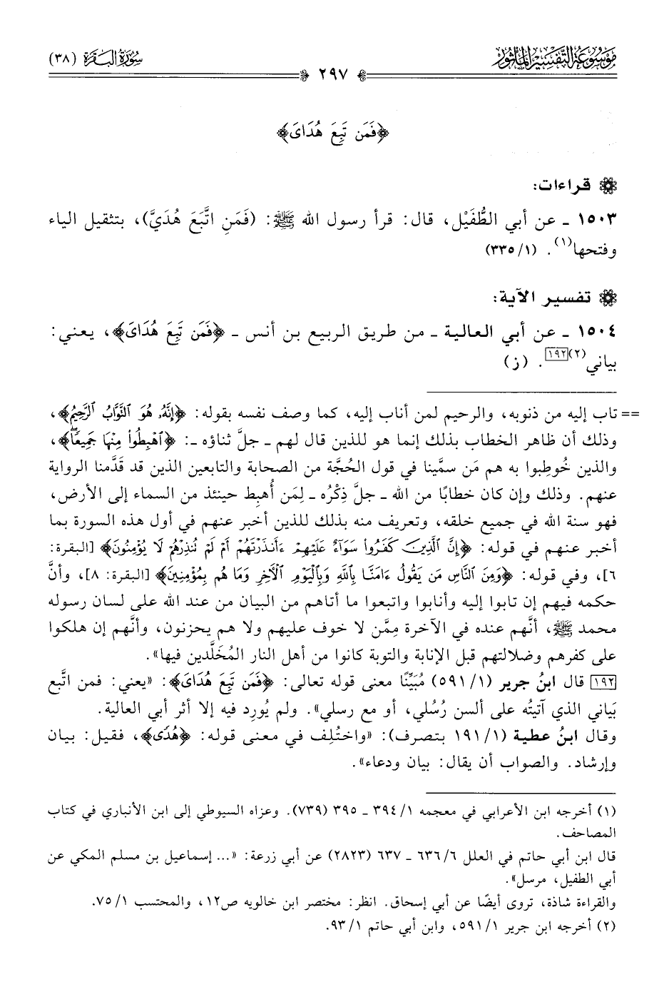 [١٩٢] قال ابنُ جرير (١/ ٥٩١) مُبَيِّنًا معنى قوله تعالى: {فمن تَبعَ هُدايَ}: «يعني: فمن اتَّبع بَياني الذي آتيتُه على ألسن رُسُلي، أو مع رسلي». ولم يُورِد فيه إلا أثر أبي العالية.