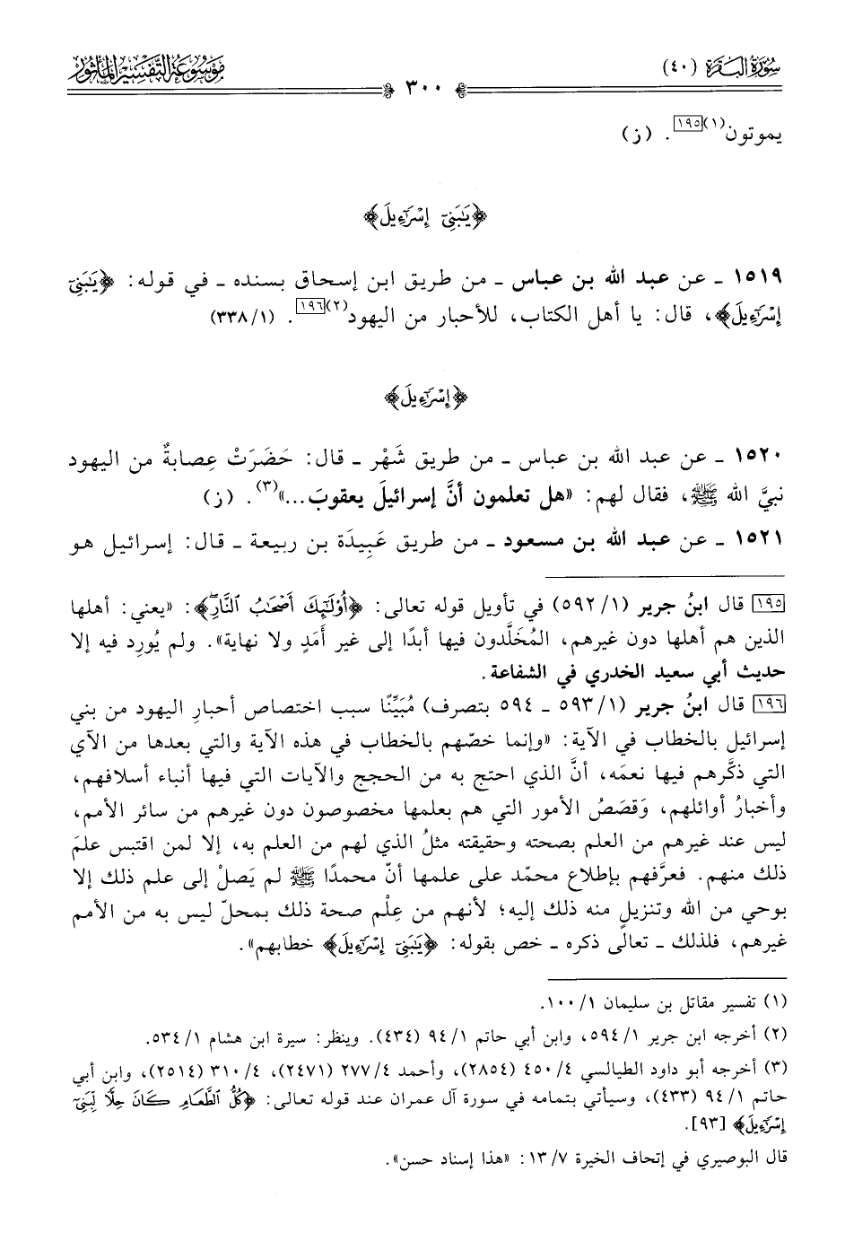 ١٥١٩ - عن عبد الله بن عباس -من طريق ابن إسحاق بسنده- في قوله: {يا بني إسرائيل}، قال: يا أهل الكتاب، للأحبار من اليهود (¬٢) [١٩٦]. (١/ ٣٣٨)