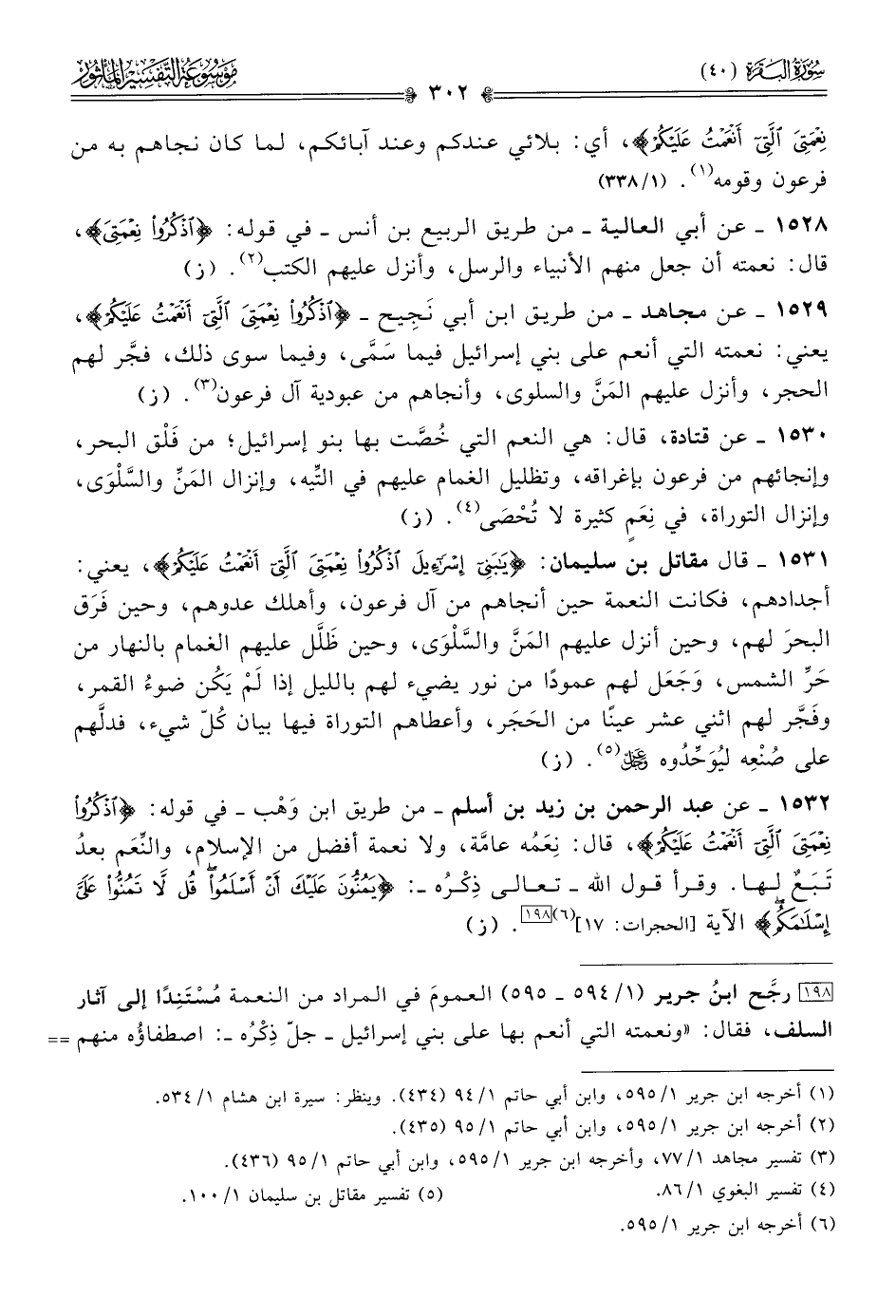 ١٥٢٩ - عن مجاهد -من طريق ابن أبي نَجِيح- {اذكروا نعمتي التي أنعمت عليكم}، يعني: نعمته التي أنعم على بني إسرائيل فيما سَمّى، وفيما سوى ذلك، فجَّر لهم الحجر، وأنزل عليهم المَنَّ والسلوى، وأنجاهم من عبودية آل فرعون (¬٣). (ز)