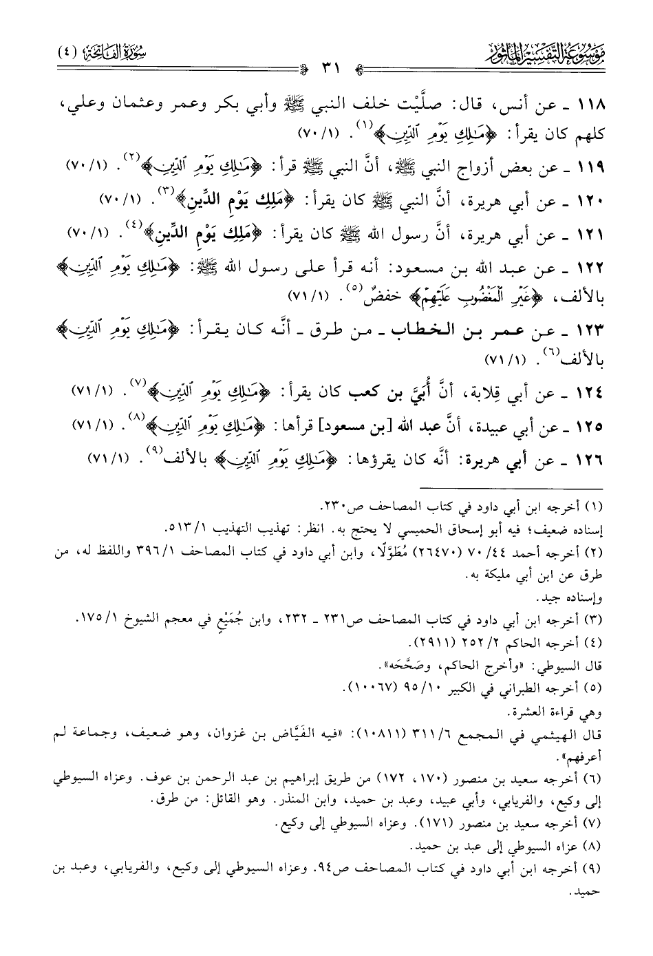 ١٢٦ - عن أبي هريرة: أنّه كان يقرؤها: {مالِكِ يَوْمِ الدِّينِ} بالألف (¬٩). (١/ ٧٠)