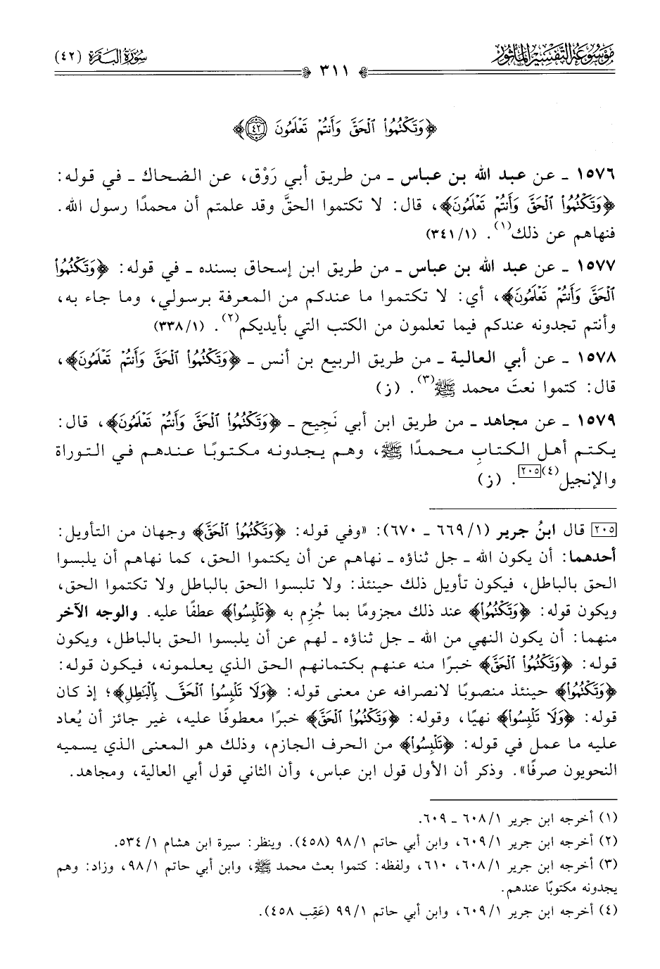 ١٥٧٩ - عن مجاهد -من طريق ابن أبي نَجِيح- {وتكتموا الحق وأنتم تعلمون}، قال: يكتم أهل الكتابِ محمدًا - صلى الله عليه وسلم -، وهم يجدونه مكتوبًا عندهم في التوراة والإنجيل (¬٤) [٢٠٥]. (ز)
