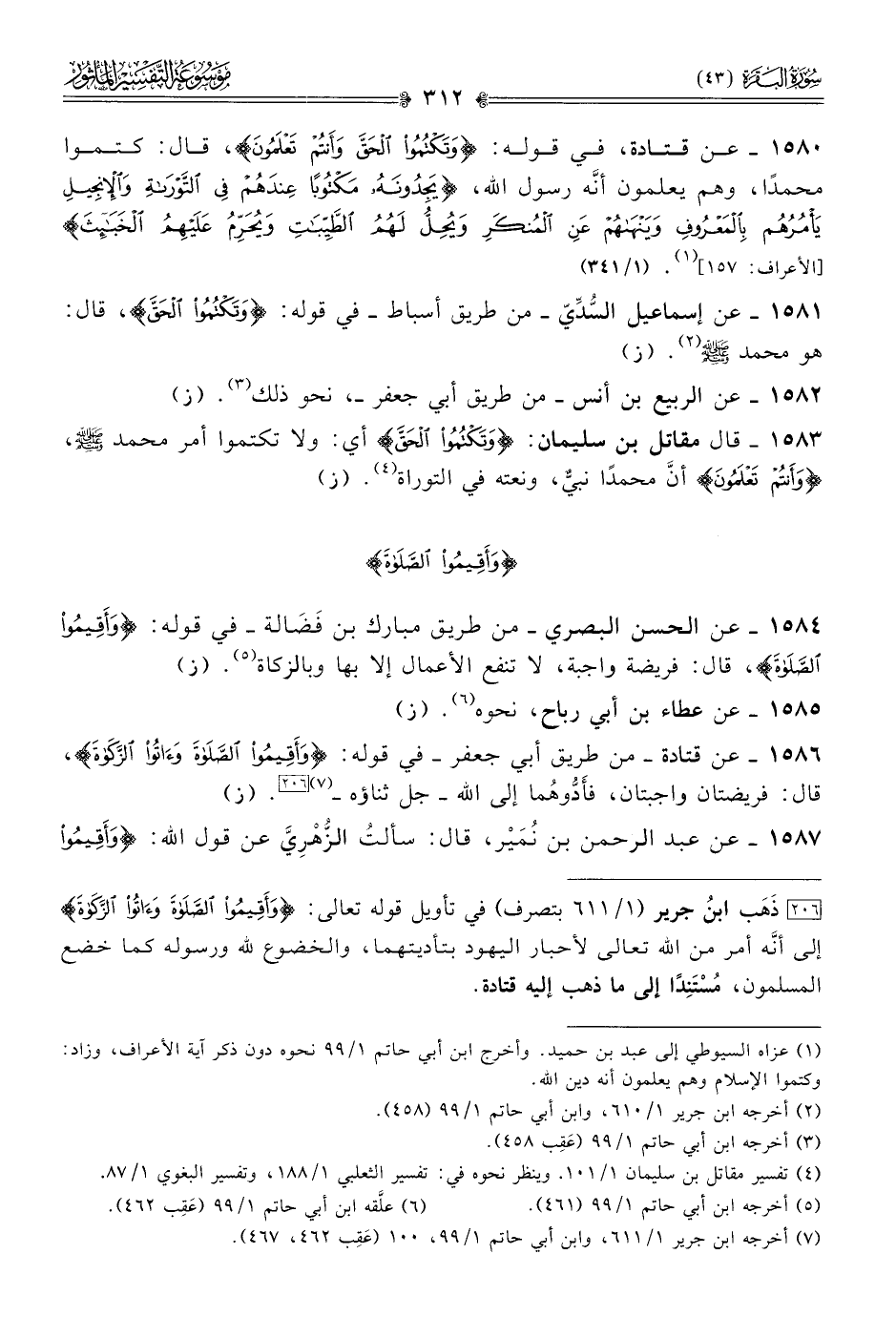١٥٨٠ - عن قتادة، في قوله: {وتكتموا الحق وأنتم تعلمون}، قال: كتموا محمدًا، وهم يعلمون أنّه رسول الله، {يجدونه مكتوبا عندهم في التوراة والإنجيل يأمرهم بالمعروف وينهاهم عن المنكر ويحل لهم الطيبات ويحرم عليهم الخبائث} [الأعراف: ١٥٧] (¬١). (١/ ٣٤١)