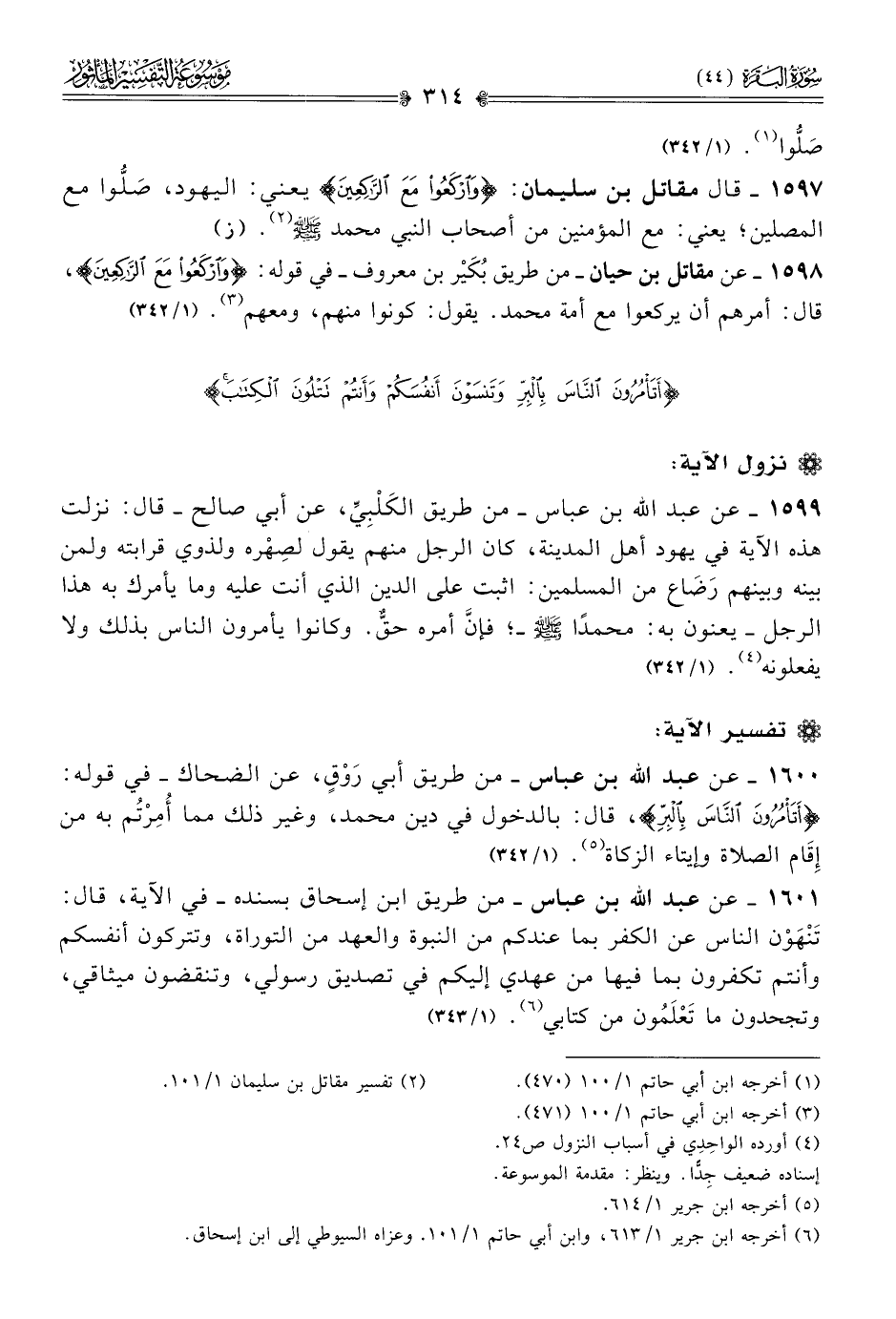 ١٦٠٠ - عن عبد الله بن عباس -من طريق أبي رَوْقٍ، عن الضحاك- في قوله: {أتأمرون الناس بالبر}، قال: بالدخول في دين محمد، وغير ذلك مما أُمِرْتُم به من إقام الصلاة وإيتاء الزكاة (¬٥). (١/ ٣٤٢)