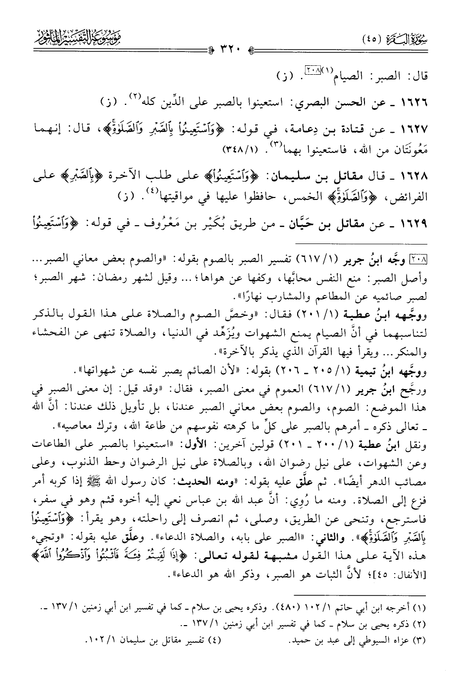 ١٦٢٧ - عن قتادة بن دِعامة، في قوله: {واستعينوا بالصبر والصلاة}، قال: إنهما مَعُونَتان من الله، فاستعينوا بهما (¬٣). (١/ ٣٤٨)