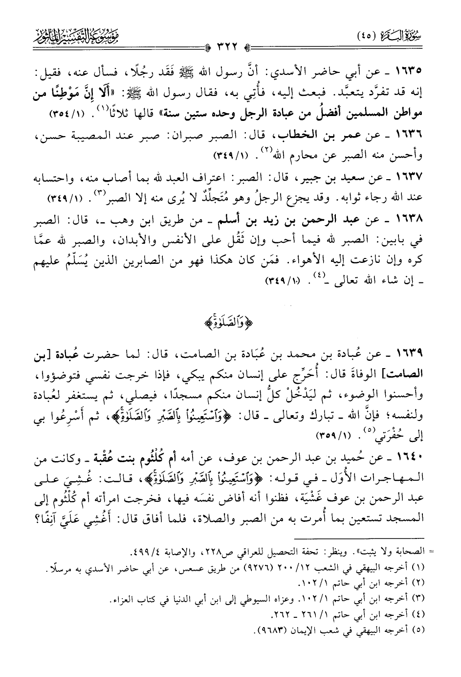 ١٦٣٩ - عن عُبادة بن محمد بن عُبادة بن الصامت، قال: لما حضرت عُبادة [بن الصامت] الوفاةَ قال: أُحَرِّج على إنسان منكم يبكي، فإذا خرجت نفسي فتوضؤوا، وأحسنوا الوضوء، ثم ليَدْخُلْ كلُّ إنسان منكم مسجدًا، فيصلي، ثم يستغفر لعُبادة ولنفسه؛ فإنّ الله -تبارك وتعالى- قال: {واستعينوا بالصبر والصلاة}، ثم أسْرِعُوا بي إلى حُفْرَتي (¬٥). (١/ ٣٥٩)
