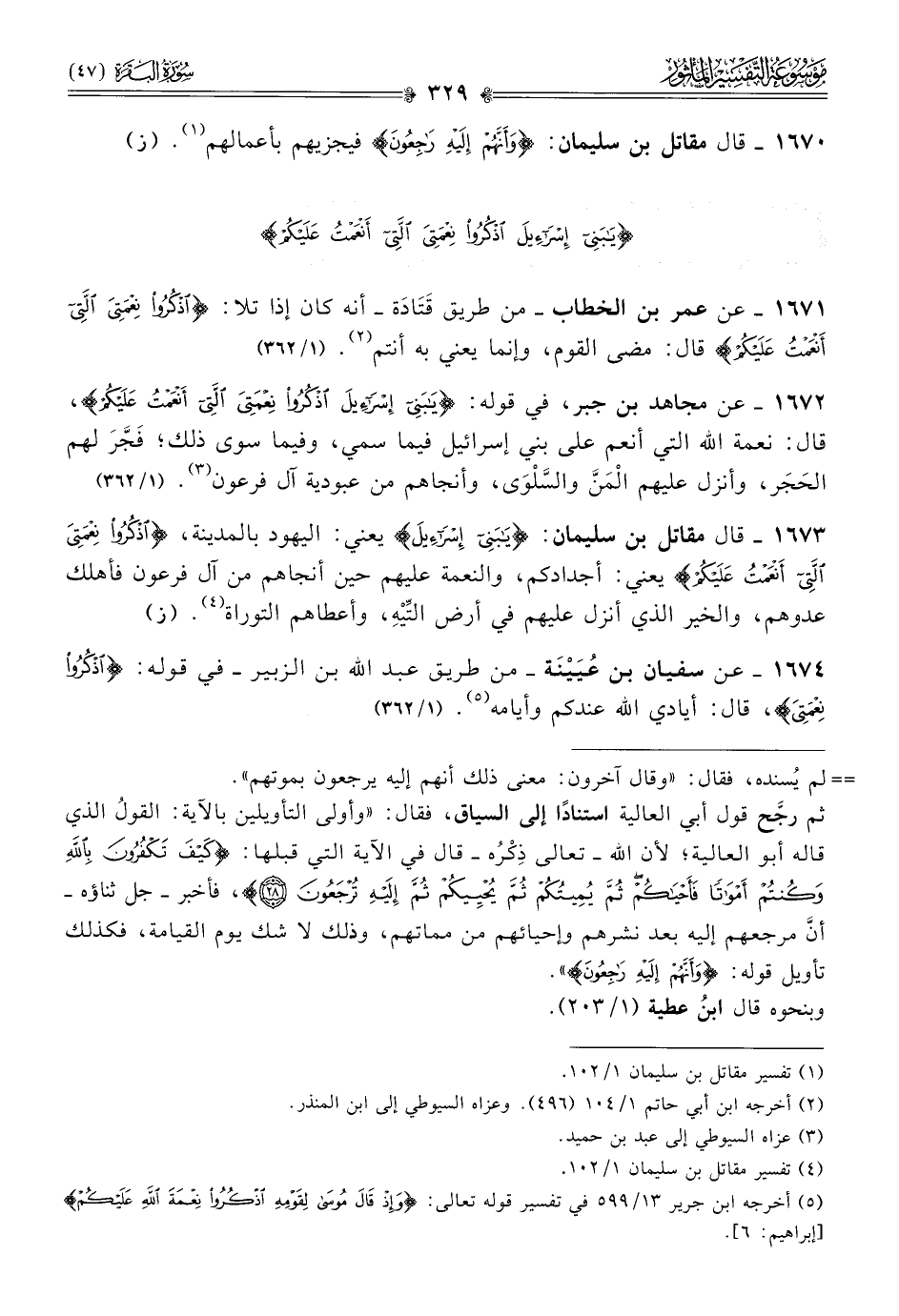 ١٦٧٢ - عن مجاهد بن جبر، في قوله: {يا بني إسرائيل اذكروا نعمتي التي أنعمت عليكم}، قال: نعمة الله التي أنعم على بني إسرائيل فيما سمي، وفيما سوى ذلك؛ فَجَّرَ لهم الحَجَر، وأنزل عليهم المَنَّ والسَّلْوى، وأنجاهم من عبودية آل فرعون (¬٣). (١/ ٣٦٢)