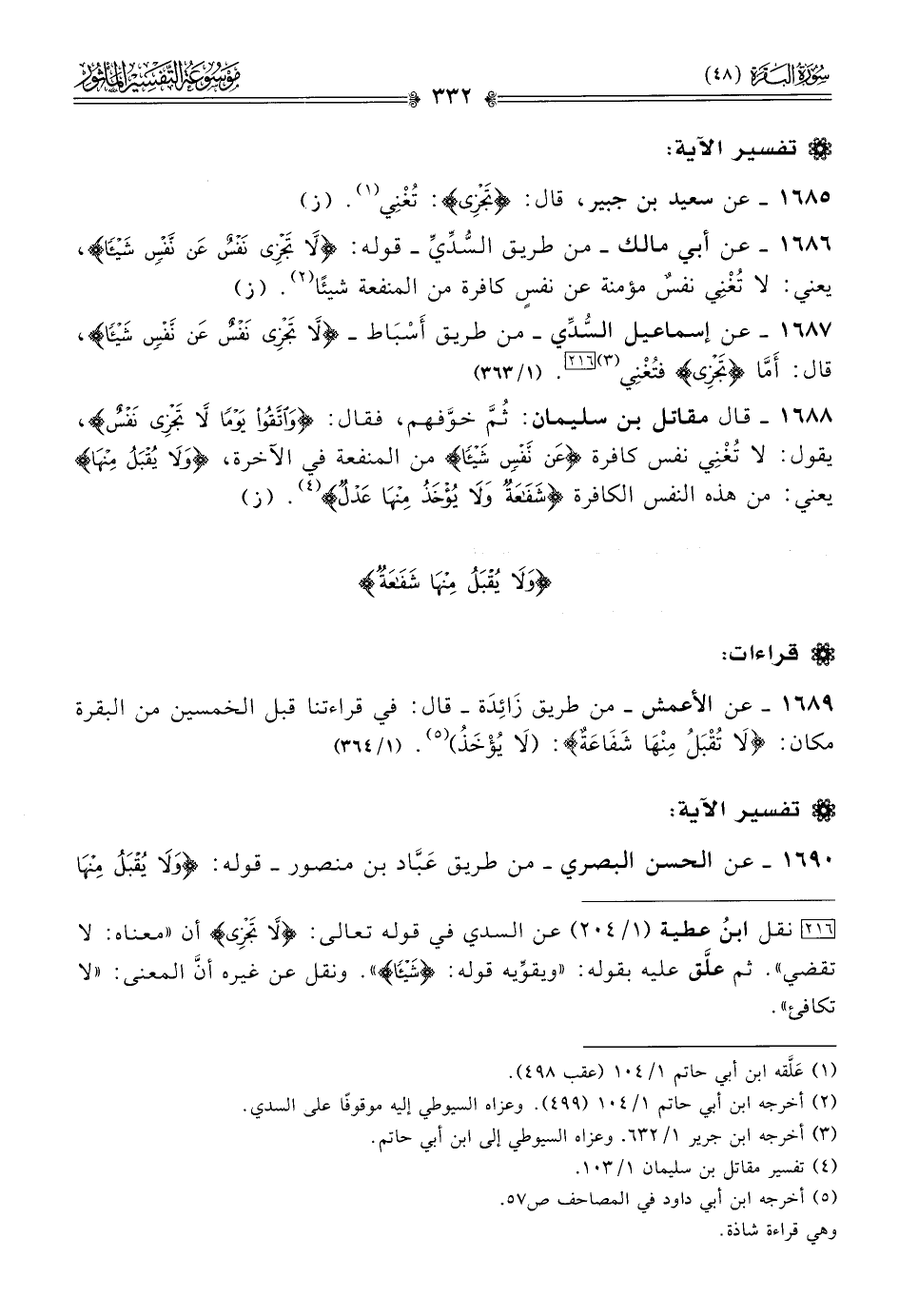 [٢١٦] نقل ابنُ عطية (١/ ٢٠٤) عن السدي في قوله تعالى: {لا تَجْزِي} أن «معناه: لا تقضي». ثم علَّق عليه بقوله: «ويقوِّيه قوله: {شَيْئًا}». ونقل عن غيره أنّ المعنى: «لا تكافئ».