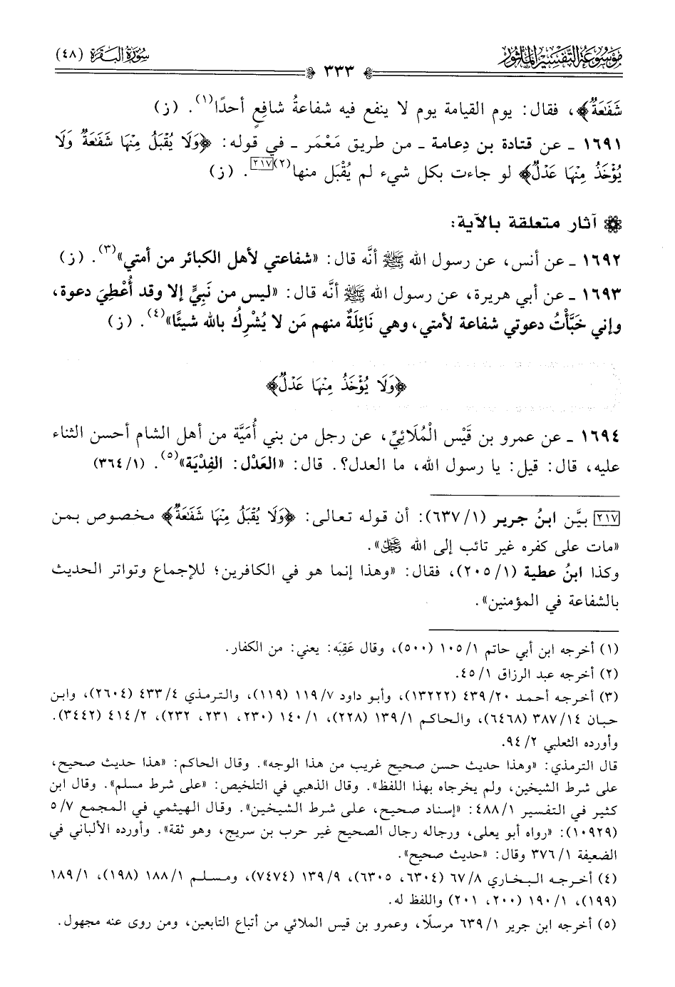 [٢١٧] بيَّن ابنُ جرير (١/ ٦٣٧): أن قوله تعالى: {ولا يُقبَل منها شفاعة} مخصوص بمن «مات على كفره غير تائب إلى الله - عز وجل -».