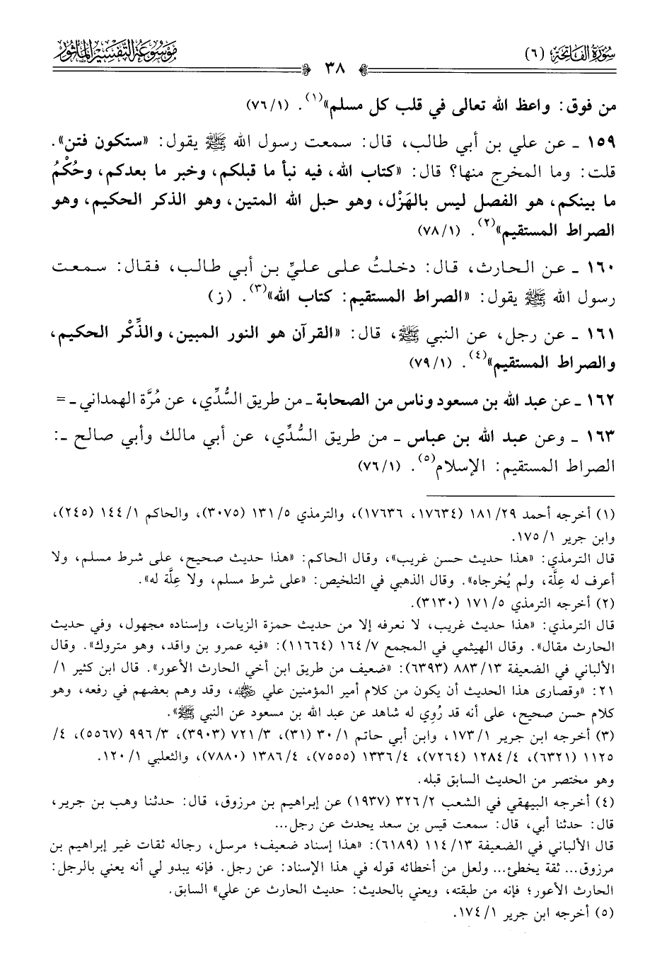 ١٦٠ - عن الحارث، قال: دخلتُ على عليِّ بن أبي طالب، فقال: سمعت رسول الله - صلى الله عليه وسلم - يقول: «الصراط المستقيم: كتاب الله» (¬٣). (ز)