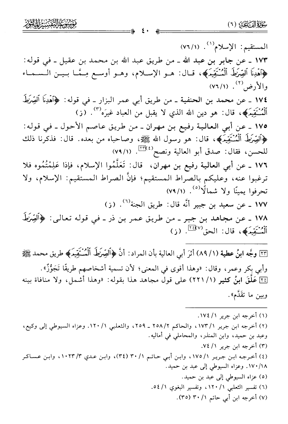 ١٧٨ - عن مجاهد بن جبر -من طريق عمر بن ذر- في قوله تعالى: {الصِّرَاطَ الْمُسْتَقِيمَ}، قال: الحق (¬٧) [٢٤]. (ز)