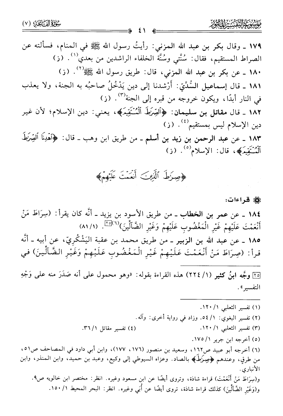 ١٨٤ - عن عمر بن الخطاب -من طريق الأسود بن يزيد- أنّه كان يقرأ: (سِراطَ مَن أنْعَمْتَ عَلَيْهِمْ غَيْرِ المَغْضُوبِ عَلَيْهِمْ وغَيْرِ الضَّآلِّينَ) (¬٦) [٢٥]. (١/ ٨١)