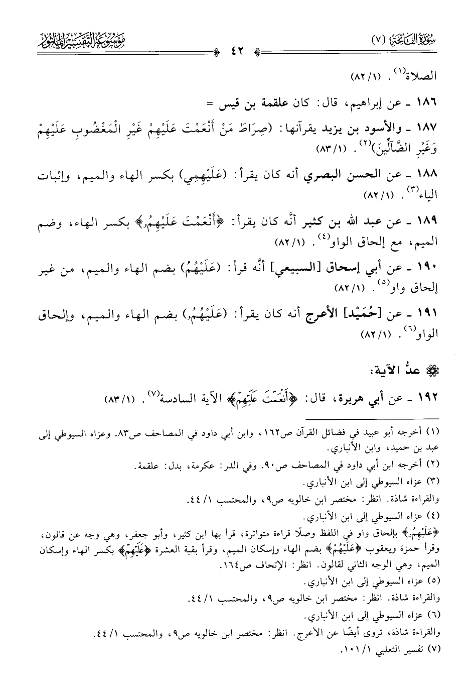 ١٨٩ - عن عبد الله بن كثير أنّه كان يقرأ: «أنْعَمْتَ عَلَيْهِمُو» بكسر الهاء، وضم الميم، مع إلحاق الواو (¬٤). (١/ ٨٢)