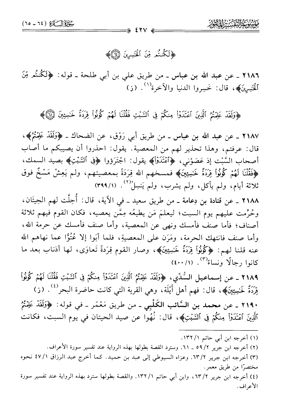 ٢١٨٧ - عن عبد الله بن عباس -من طريق أبي رَوْق، عن الضحاك- {ولقد علمتم}، قال: عرفتم، وهذا تحذير لهم من المعصية. يقول: احذروا أن يصيبكم ما أصاب أصحاب السَّبْت إذ عَصَوْني، {اعتدوا} يقول: اجْتَرَؤوا {في السبت} بصيد السمك، {فقلنا لهم كونوا قردة خاسئين} فمسخهم الله قِرَدَةً بمعصيتهم، ولم يَعِشْ مَسْخٌ فوق ثلاثة أيام، ولم يأكل، ولم يشرب، ولم يَنسِلْ (¬٢). (١/ ٣٩٩)