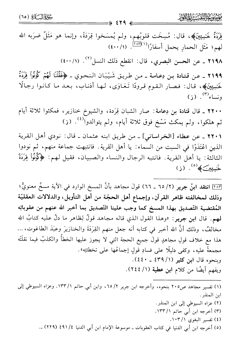[٢٨٣] انتقد ابنُ جرير (٢/ ٦٥ - ٦٦) قولَ مجاهد بأنّ المسخ الوارد في الآية مسخٌ معنويٌّ؛ وذلك لمخالفته ظاهر القرآن، وإجماع أهل الحجّة من أهل التأويل، والدلالات العقليّة المُقتضية التّصديق بهذا المسخ كما وجب علينا التّصديق بما أخبر الله عنهم من عقوباتِه لهم. قال ابن جرير: «وهذا القول الذي قاله مجاهد قولٌ لِظاهر ما دلَّ عليه كتابُ الله مخالفٌ، وذلك أنّ الله أخبر في كتابه أنه جعل منهم القِرَدَةَ والخنازيرَ وعبَدَ الطاغوت، ... هذا مع خلاف قولِ مجاهدٍ قولَ جميع الحجة التي لا يجوز عليها الخطأُ والكذبُ فيما نقلَتْه مجمعةً عليه، وكفى دليلًا على فسادِ قولٍٍ إجماعُها على تخطئتِه».
