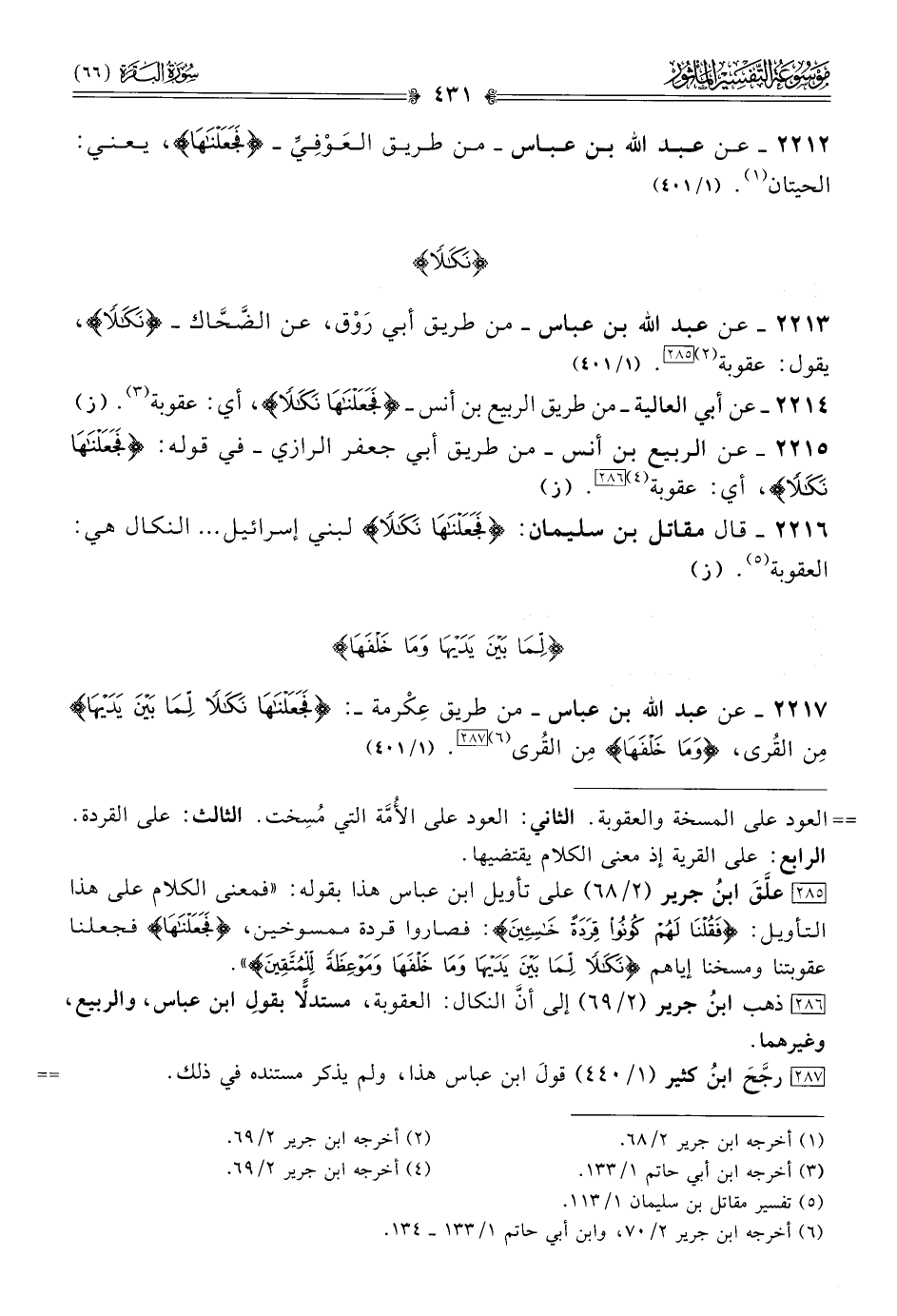٢٢١٧ - عن عبد الله بن عباس -من طريق عِكْرمة-: {فجعلناها نكالا لما بين يديها} مِن القُرى، {وما خلفها} مِن القُرى (¬٦) [٢٨٧]. (١/ ٤٠١)