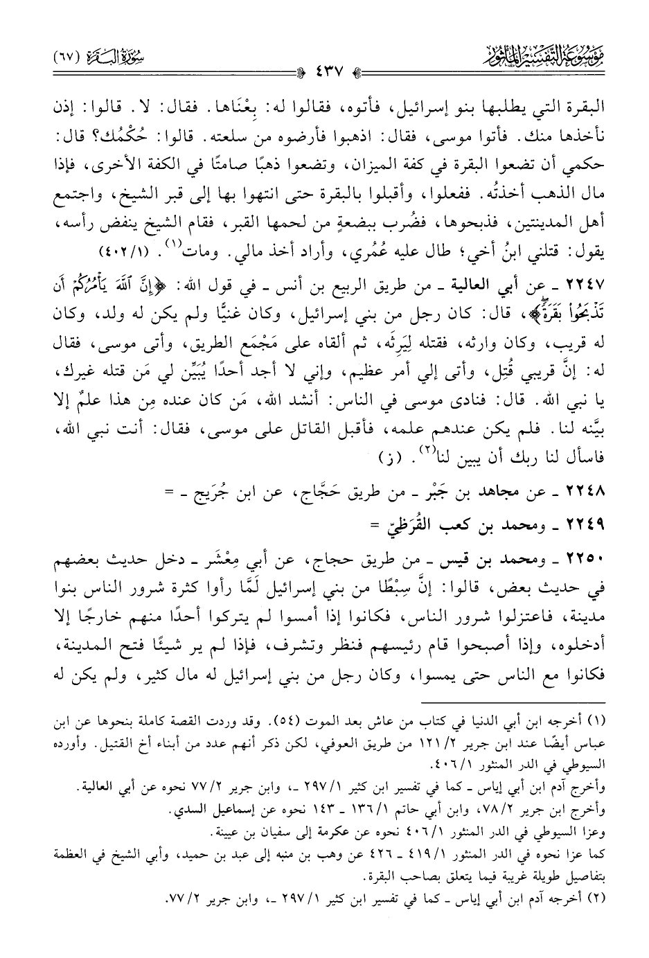 ٢٢٤٧ - عن أبي العالية -من طريق الربيع بن أنس- في قول الله: {إن الله يأمركم أن تذبحوا بقرة}، قال: كان رجل من بني إسرائيل، وكان غنيًّا ولم يكن له ولد، وكان له قريب، وكان وارثه، فقتله لِيَرِثَه، ثم ألقاه على مَجْمَع الطريق، وأتى موسى، فقال له: إنّ قريبي قُتِل، وأتى إلي أمر عظيم، وإني لا أجد أحدًا يُبَيِّن لي مَن قتله غيرك، يا نبي الله. قال: فنادى موسى في الناس: أنشد الله، مَن كان عنده مِن هذا علمٌ إلا بيَّنه لنا. فلم يكن عندهم علمه، فأقبل القاتل على موسى، فقال: أنت نبي الله، فاسأل لنا ربك أن يبين لنا (¬٢). (ز)