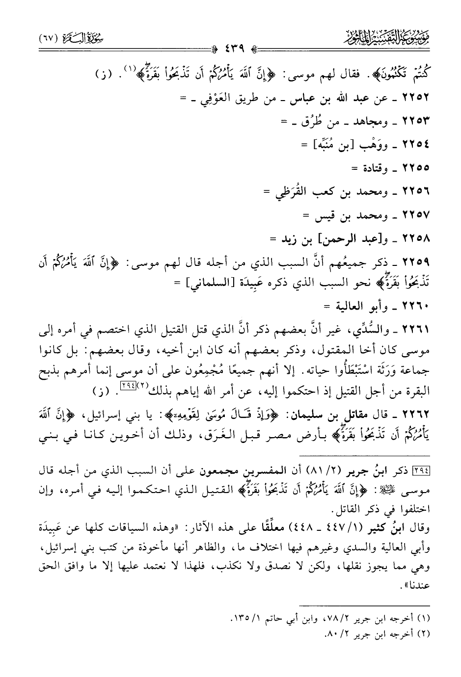 [٢٩٤] ذكر ابنُ جرير (٢/ ٨١) أن المفسرين مجمعون على أن السبب الذي من أجله قال موسى - عليه السلام -: {إن الله يأمركم أن تذبحوا بقرة} القتيل الذي احتكموا إليه في أمره، وإن اختلفوا في ذكر القاتل.