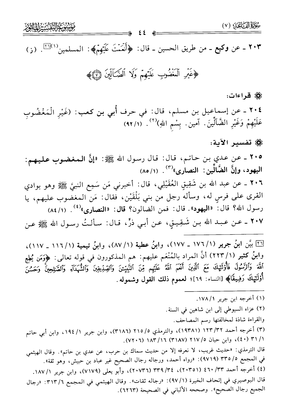 ٢٠٥ - عن عدي بن حاتم، قال: قال رسول الله - صلى الله عليه وسلم -: «إنّ المغضوب عليهم: اليهود، وإنّ الضّالِّين: النصارى» (¬٣). (١/ ٨٥)