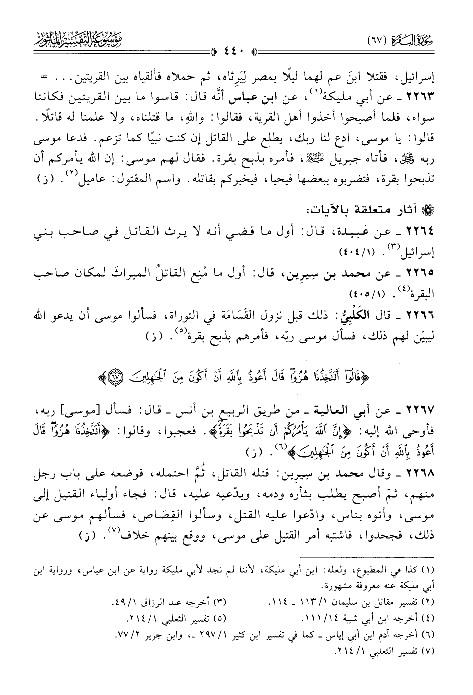 ٢٢٦٧ - عن أبي العالية -من طريق الربيع بن أنس- قال: فسأل [موسى] ربه، فأوحى الله إليه: {إن الله يأمركم أن تذبحوا بقرة}. فعجبوا، وقالوا: {أتتخذنا هزوا قال أعوذ بالله أن أكون من الجاهلين} (¬٦). (ز)