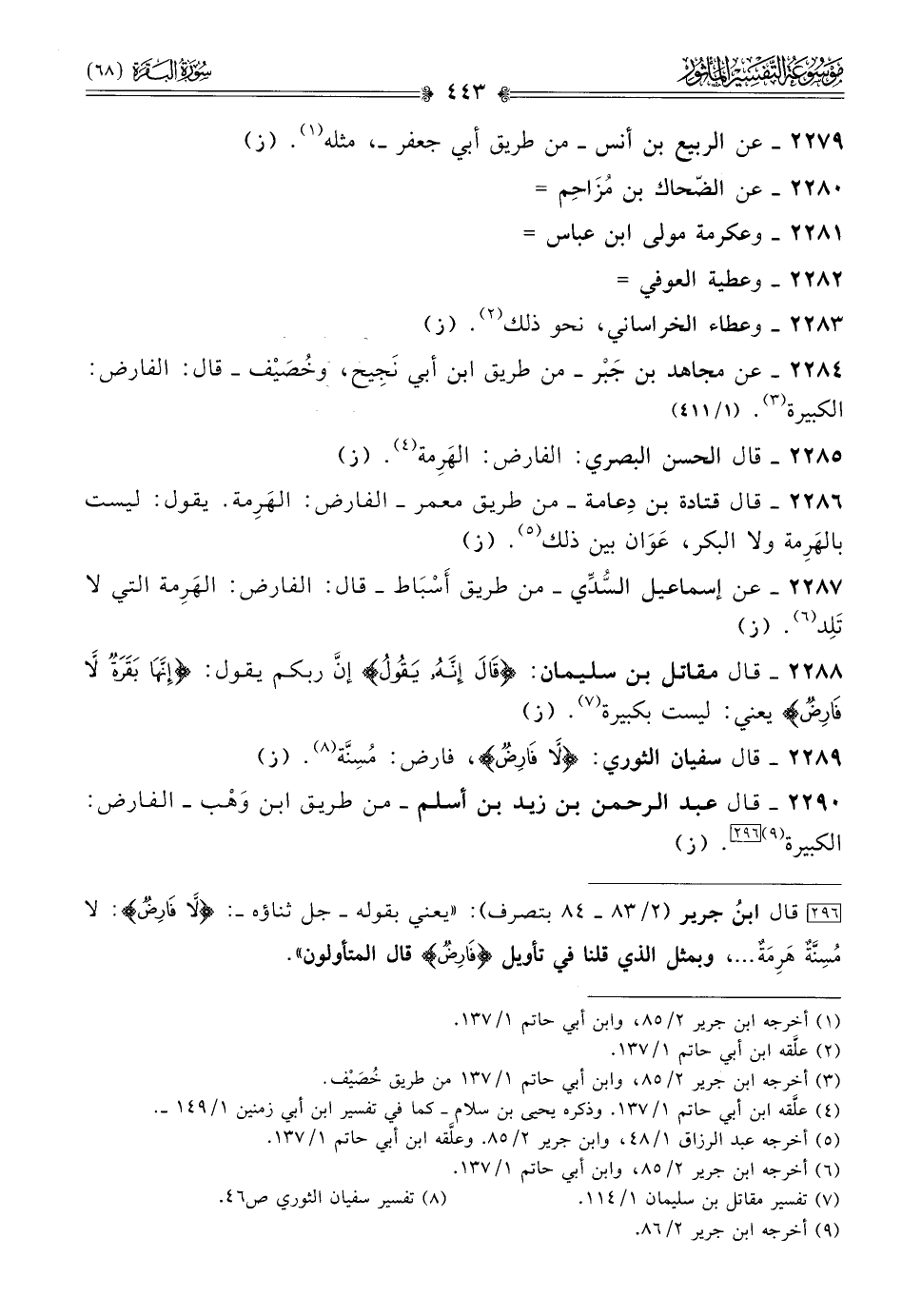 [٢٩٦] قال ابنُ جرير (٢/ ٨٣ - ٨٤ بتصرف): «يعني بقوله -جل ثناؤه-: {لا فارِضٌ}: لا مُسِنَّةٌ هَرِمَةٌ ... ، وبمثل الذي قلنا في تأويل {فارِض} قال المتأولون».