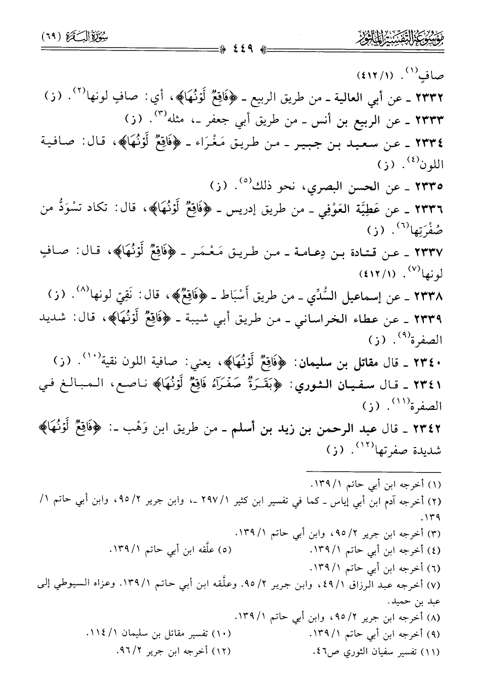 ٢٣٣٩ - عن عطاء الخراساني-من طريق أبي شيبة- {فاقع لونها}، قال: شديد الصفرة (¬٩). (ز)