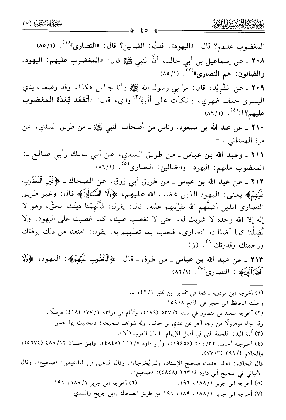 ٢١٣ - عن عبد الله بن عباس -من طرق- قال: {المغضوب عليهم}: اليهود، {وَلَا الضَّالِّينَ}: النصارى (¬٧). (١/ ٨٦)