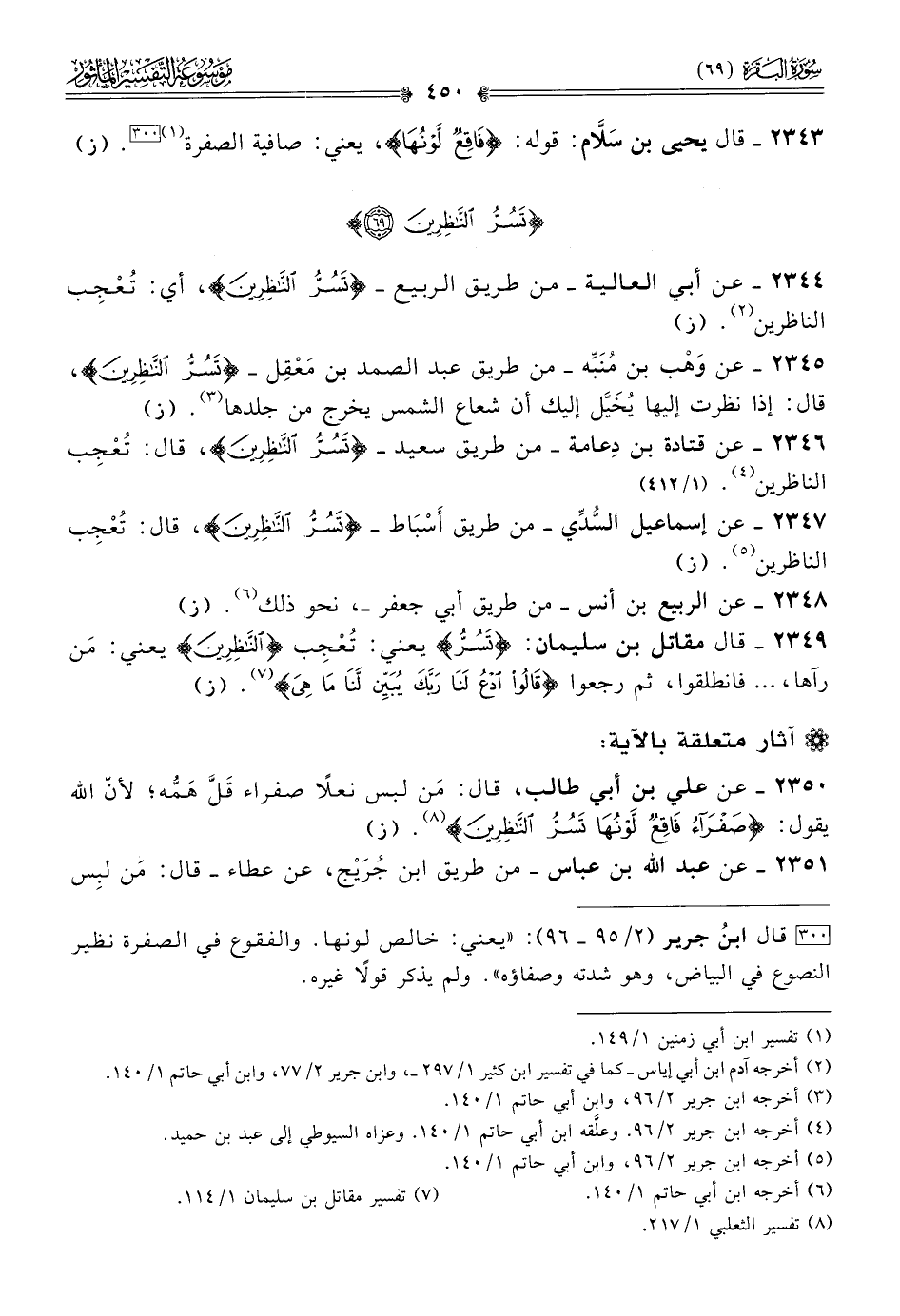 ٢٣٤٦ - عن قتادة بن دِعامة -من طريق سعيد- {تسر الناظرين}، قال: تُعْجِب الناظرين (¬٤). (١/ ٤١٢)