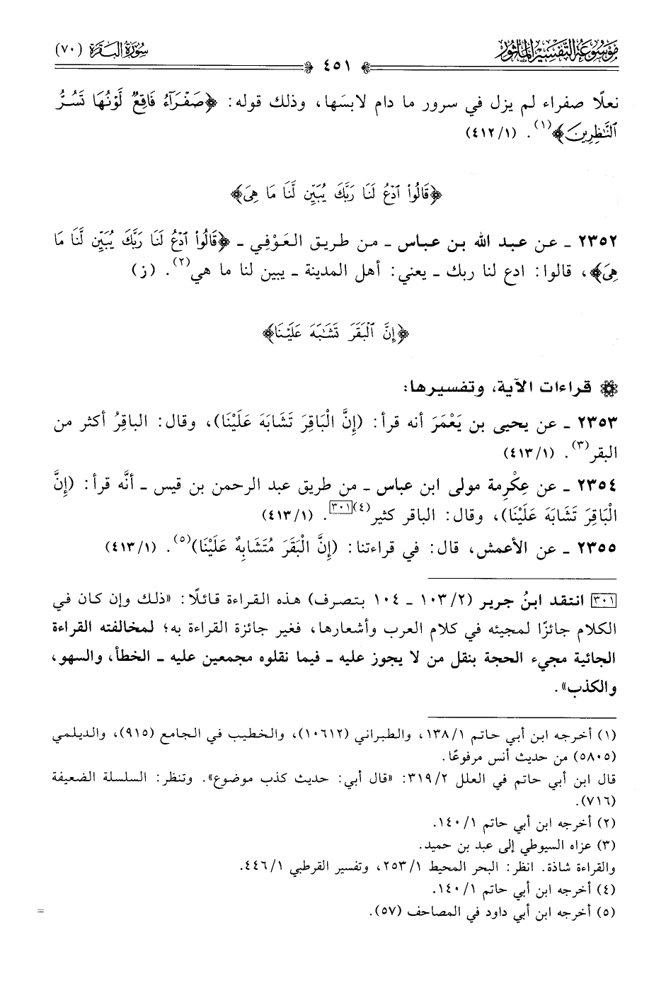 ٢٣٥٤ - عن عِكْرِمة مولى ابن عباس -من طريق عبد الرحمن بن قيس- أنّه قرأ: (إنَّ الباقِرَ تَشابَهَ عَلَيْنا)، وقال: الباقر كثير (¬٤) [٣٠١]. (١/ ٤١٣)