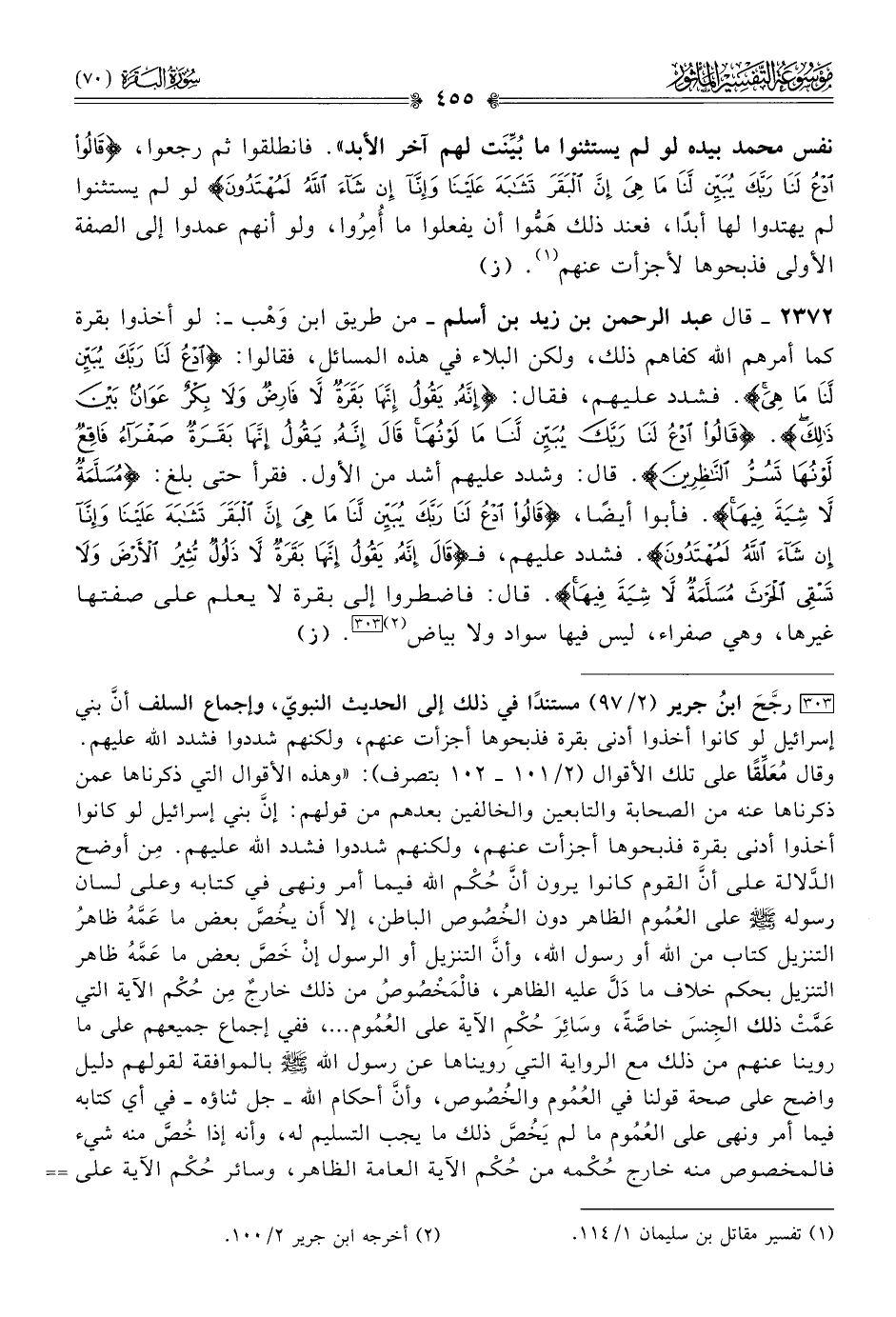 [٣٠٣] رجَّحَ ابنُ جرير (٢/ ٩٧) مستندًا في ذلك إلى الحديث النبويّ، وإجماع السلف أنّ بني إسرائيل لو كانوا أخذوا أدنى بقرة فذبحوها أجزأت عنهم، ولكنهم شددوا فشدد الله عليهم.