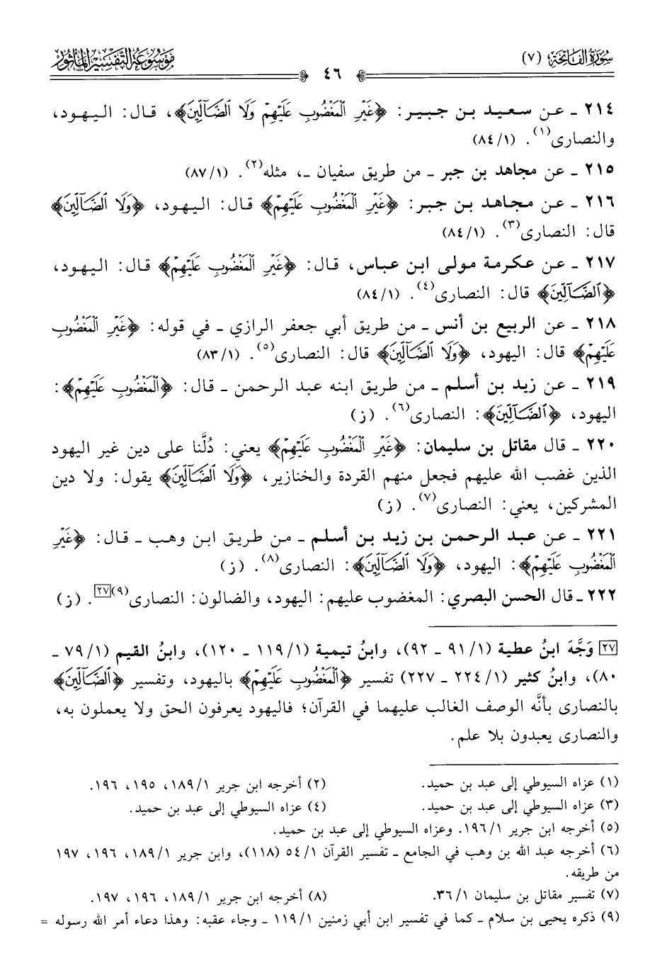 ٢١٦ - عن مجاهد بن جبر: {غَيْرِ الْمَغْضُوبِ عَلَيْهِمْ} قال: اليهود، {وَلَا الْضَّالِّينَ} قال: النصارى (¬٣). (١/ ٨٤)