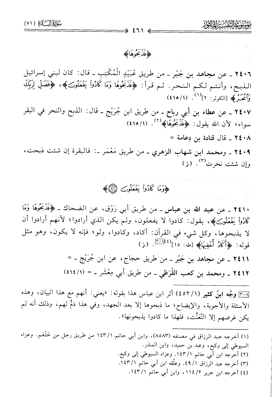 [٣٠٨] وجَّه ابنُ كثير (١/ ٤٥٢) أثر ابن عباس هذا بقوله: «يعني: أنهم مع هذا البيان، وهذه الأسئلة والأجوبة، والإيضاح؛ ما ذبحوها إلا بعد الجهد، وفي هذا ذمٌّ لهم، وذلك أنه لم يكن غرضهم إلا التَّعَنُّت، فلهذا ما كادوا يذبحونها».
