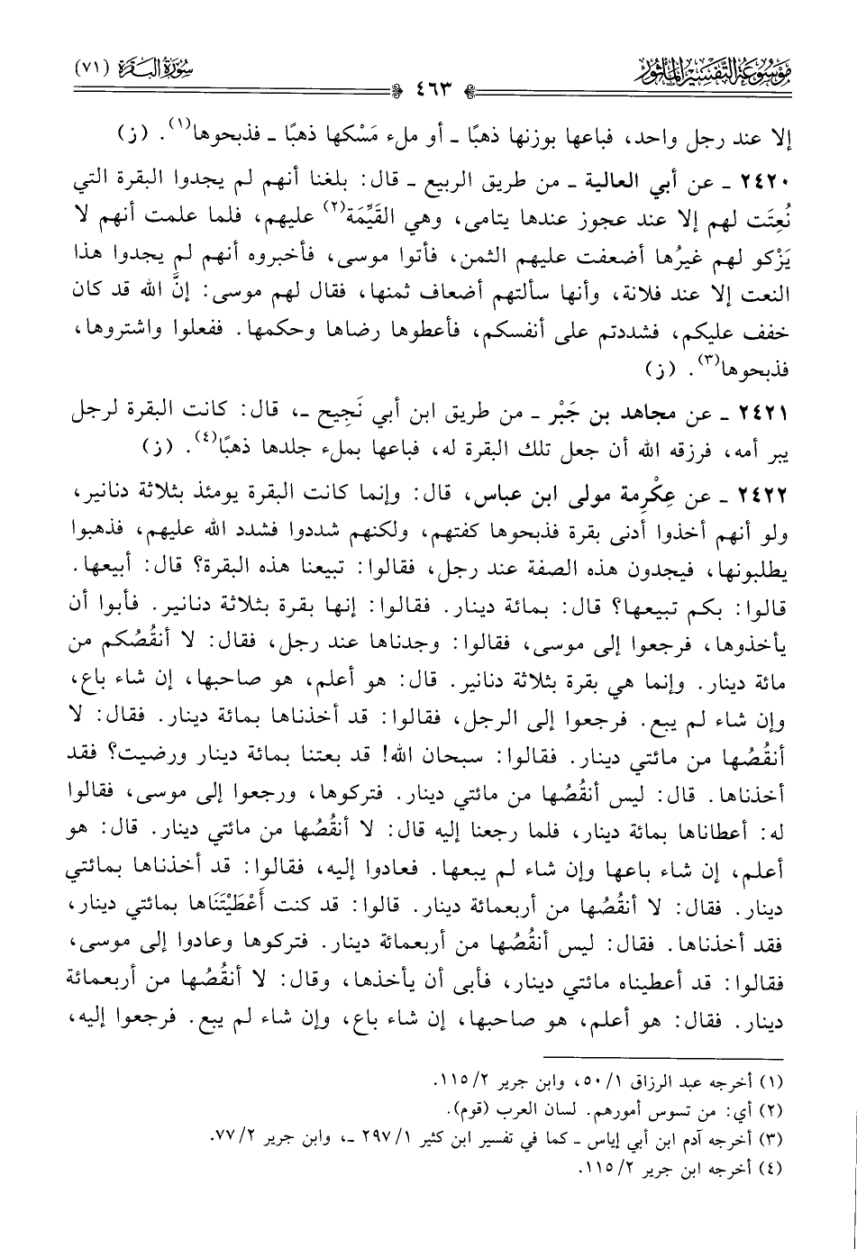 ٢٤٢٢ - عن عِكْرِمة مولى ابن عباس، قال: وإنما كانت البقرة يومئذ بثلاثة دنانير، ولو أنهم أخذوا أدنى بقرة فذبحوها كفتهم، ولكنهم شددوا فشدد الله عليهم، فذهبوا يطلبونها، فيجدون هذه الصفة عند رجل، فقالوا: تبيعنا هذه البقرة؟ قال: أبيعها. قالوا: بكم تبيعها؟ قال: بمائة دينار. فقالوا: إنها بقرة بثلاثة دنانير. فأبوا أن يأخذوها، فرجعوا إلى موسى، فقالوا: وجدناها عند رجل، فقال: لا أنقُصُكم من مائة دينار. وإنما هي بقرة بثلاثة دنانير. قال: هو أعلم، هو صاحبها، إن شاء باع، وإن شاء لم يبع. فرجعوا إلى الرجل، فقالوا: قد أخذناها بمائة دينار. فقال: لا أنقُصُها من مائتي دينار. فقالوا: سبحان الله! قد بعتنا بمائة دينار ورضيت؟ فقد أخذناها. قال: ليس أنقُصُها من مائتي دينار. فتركوها، ورجعوا إلى موسى، فقالوا له: أعطاناها بمائة دينار، فلما رجعنا إليه قال: لا أنقُصُها من مائتي دينار. قال: هو أعلم، إن شاء باعها وإن شاء لم يبعها. فعادوا إليه، فقالوا: قد أخذناها بمائتي دينار. فقال: لا أنقُصُها من أربعمائة دينار. قالوا: قد كنت أعْطَيْتَناها بمائتي دينار، فقد أخذناها. فقال: ليس أنقُصُها من أربعمائة دينار. فتركوها وعادوا إلى موسى، فقالوا: قد أعطيناه مائتي دينار، فأبى أن يأخذها، وقال: لا أنقُصُها من أربعمائة دينار. فقال: هو أعلم، هو صاحبها، إن شاء باع، وإن شاء لم يبع. فرجعوا إليه،