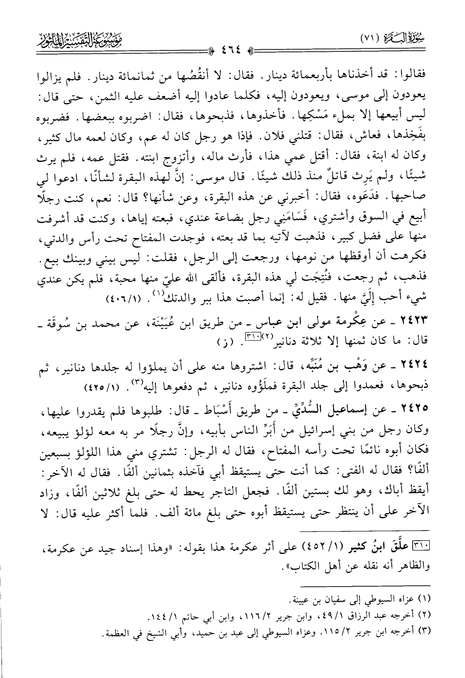 ٢٤٢٥ - عن إسماعيل السُّدِّيِّ -من طريق أسْباط- قال: طلبوها فلم يقدروا عليها، وكان رجل من بني إسرائيل من أبَرِّ الناس بأبيه، وإنّ رجلًا مر به معه لؤلؤ يبيعه، فكان أبوه نائمًا تحت رأسه المفتاح، فقال له الرجل: تشتري مني هذا اللؤلؤ بسبعين ألفًا؟ فقال له الفتى: كما أنت حتى يستيقظ أبي فآخذه بثمانين ألفًا. فقال له الآخر: أيقظ أباك، وهو لك بستين ألفًا. فجعل التاجر يحط له حتى بلغ ثلاثين ألفًا، وزاد الآخر على أن ينتظر حتى يستيقظ أبوه حتى بلغ مائة ألف. فلما أكثر عليه قال: لا