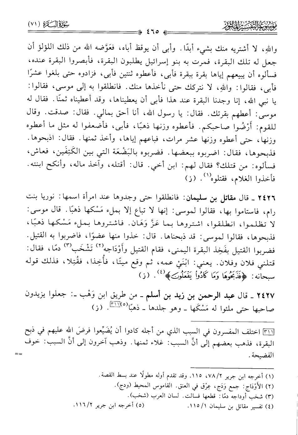 ٢٤٢٦ - قال مقاتل بن سليمان: فانطلقوا حتى وجدوها عند امرأة اسمها: نوريا بنت رام، فاستاموا بها، فقالوا لموسى: إنها لا تباع إلا بملء مَسْكها ذهبًا. قال موسى: لا تظلموا، انطلقوا، اشتروها بما عَزَّ وهان. فاشتروها بملء مَسْكها ذهبًا، فذبحوها، فقالوا لموسى: قد ذبحناها. قال: خذوا منها عضوًا، فاضربوا به القتيل. فضربوا القتيل بفَخِذ البقرة اليمنى، فقام القتيل وأَوْداجه (¬٢) تَشْخَب (¬٣) دمًا، فقال: قتلني فلان وفلان. يعني: ابْنَيْ عمه، ثم وقع ميتًا، فأُخِذا، فقُتِلا، فذلك قوله سبحانه: {فذبحوها وما كادوا يفعلون} (¬٤). (ز)