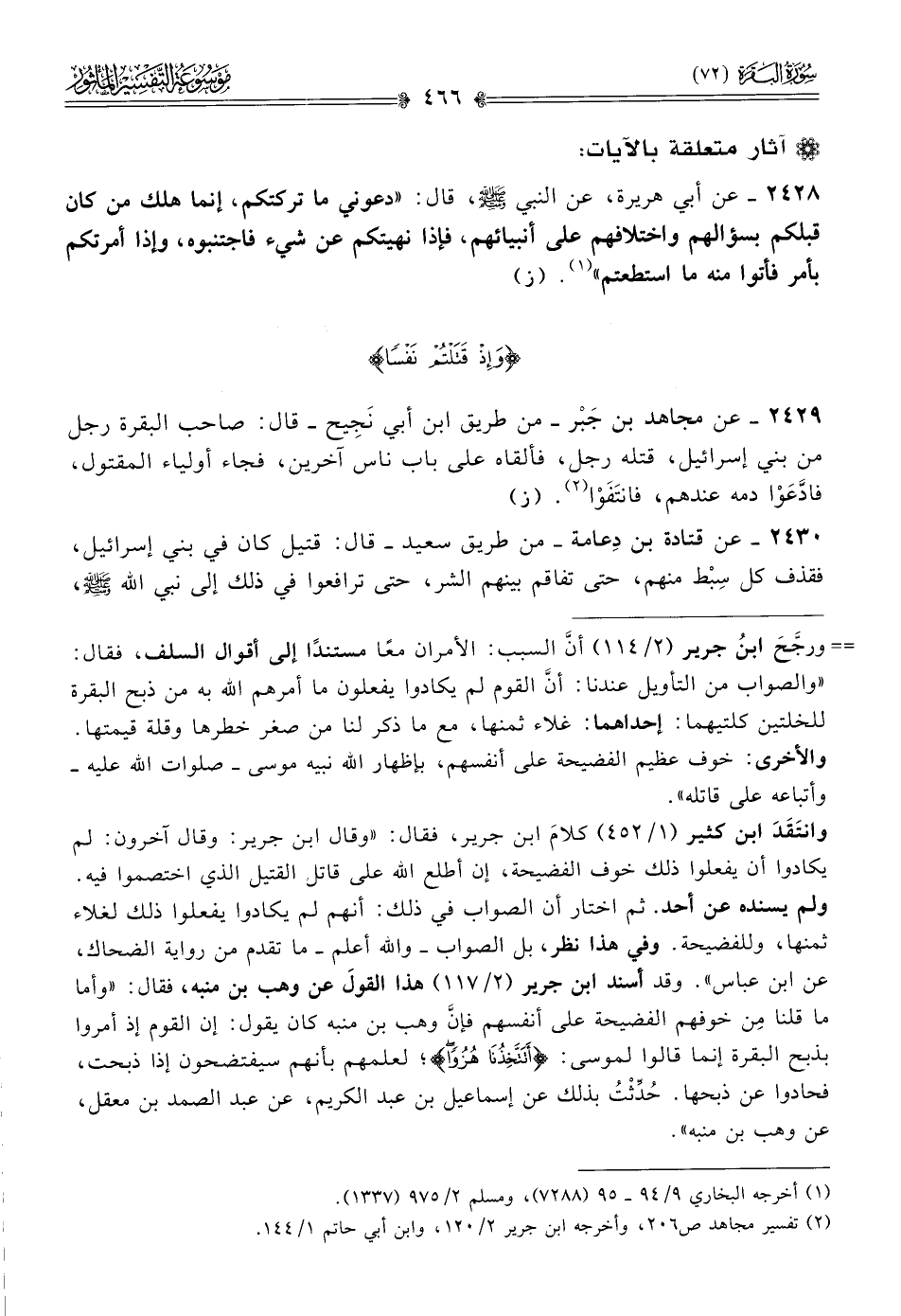 ٢٤٢٩ - عن مجاهد بن جَبْر -من طريق ابن أبي نَجِيح- قال: صاحب البقرة رجل من بني إسرائيل، قتله رجل، فألقاه على باب ناس آخرين، فجاء أولياء المقتول، فادَّعَوْا دمه عندهم، فانتَفَوْا (¬٢). (ز)